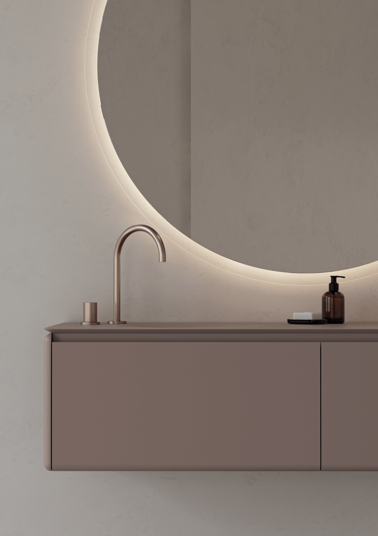 Outro ponto forte é a materialidade cuidadosamente desenvolvida para especificação técnica: tampos sólidos, lacagens de alta resistência, superfícies minerais e lavatórios integráveis. Esta variedade permite ao arquiteto manter coerência entre revestimentos, paletas cromáticas e linguagem volumétrica, preservando a intenção espacial desde o conceito até à execução.