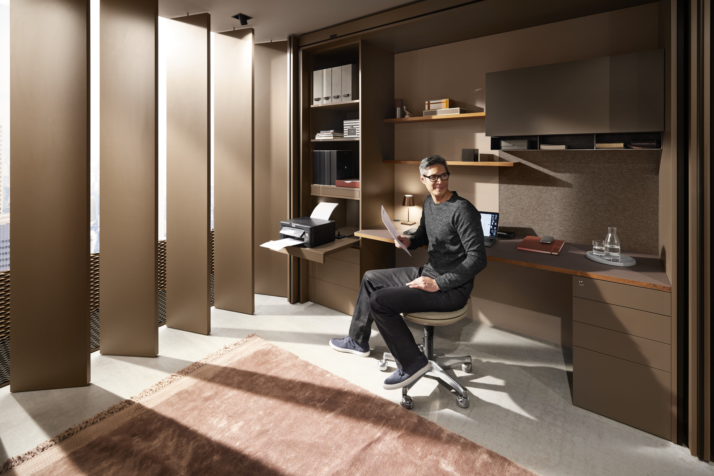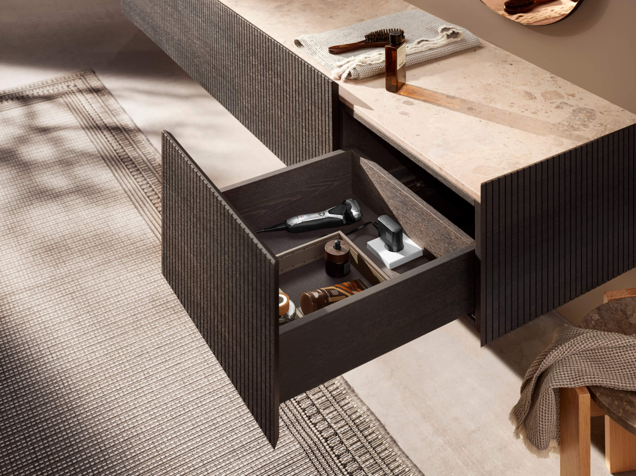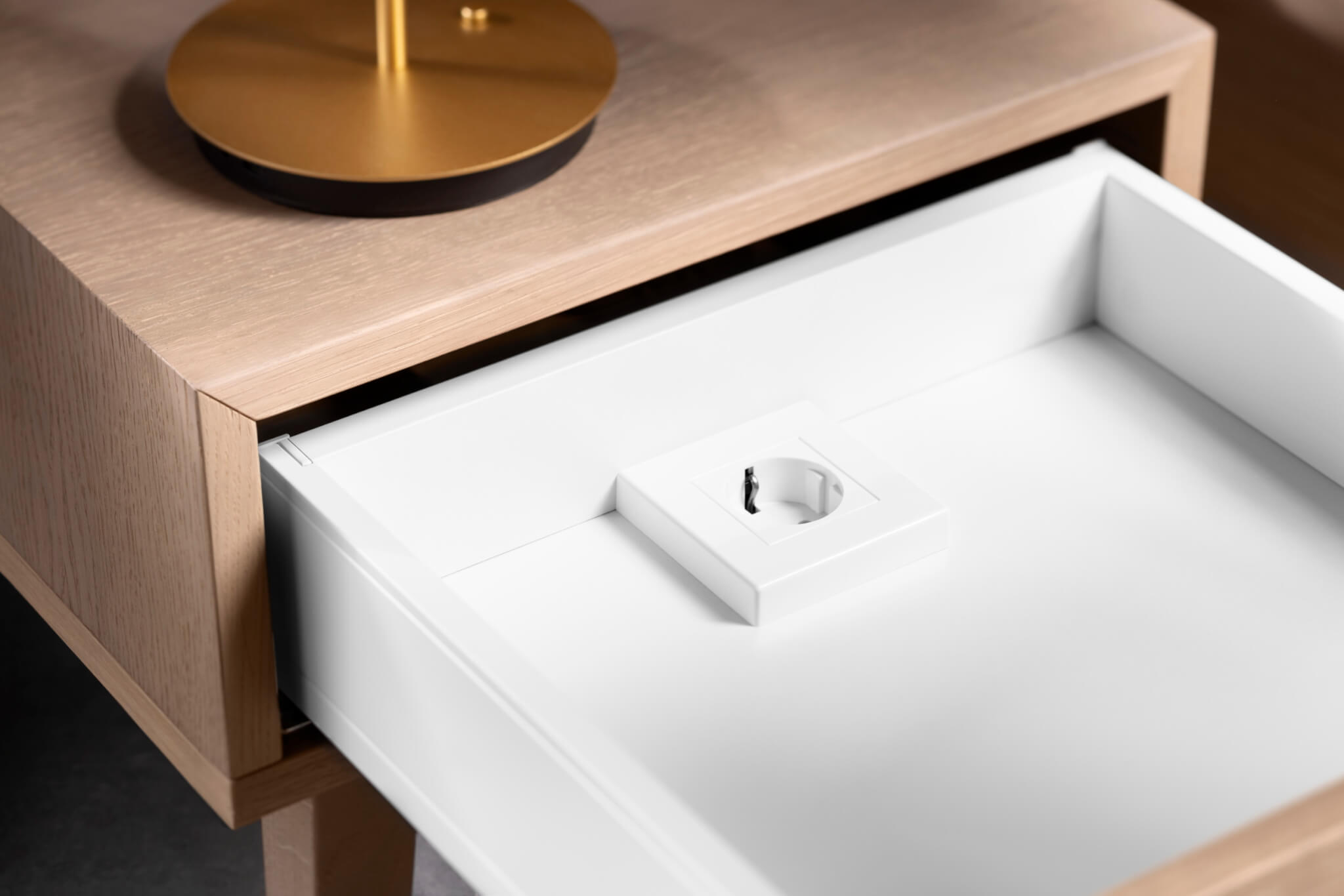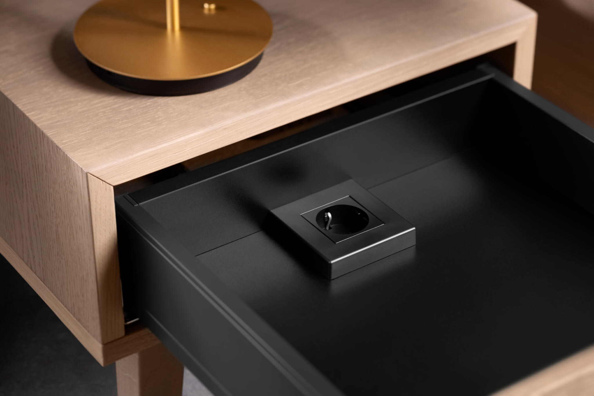 – Oculta tomadas de forma elegante em gavetas e prateleiras extraíveis