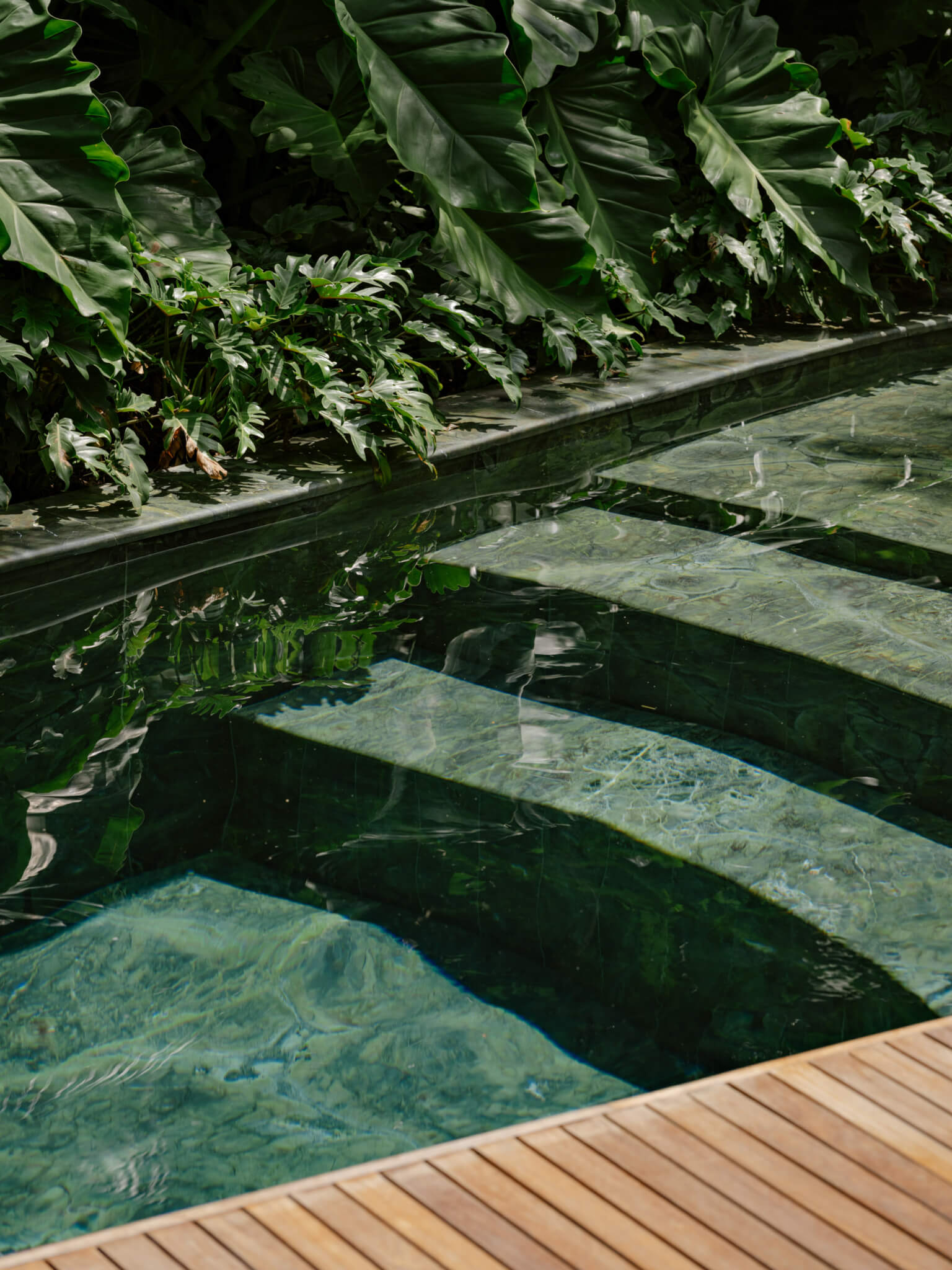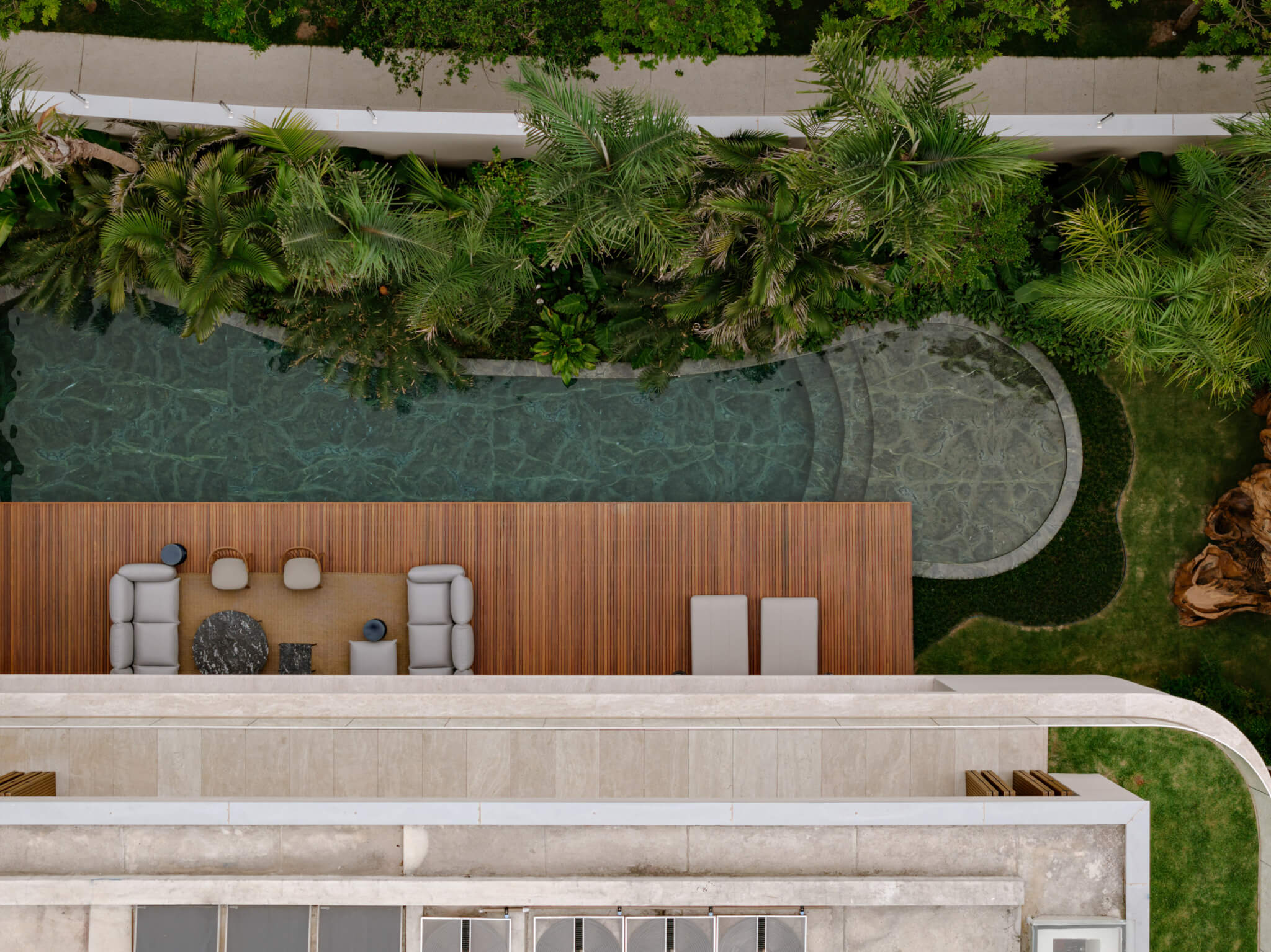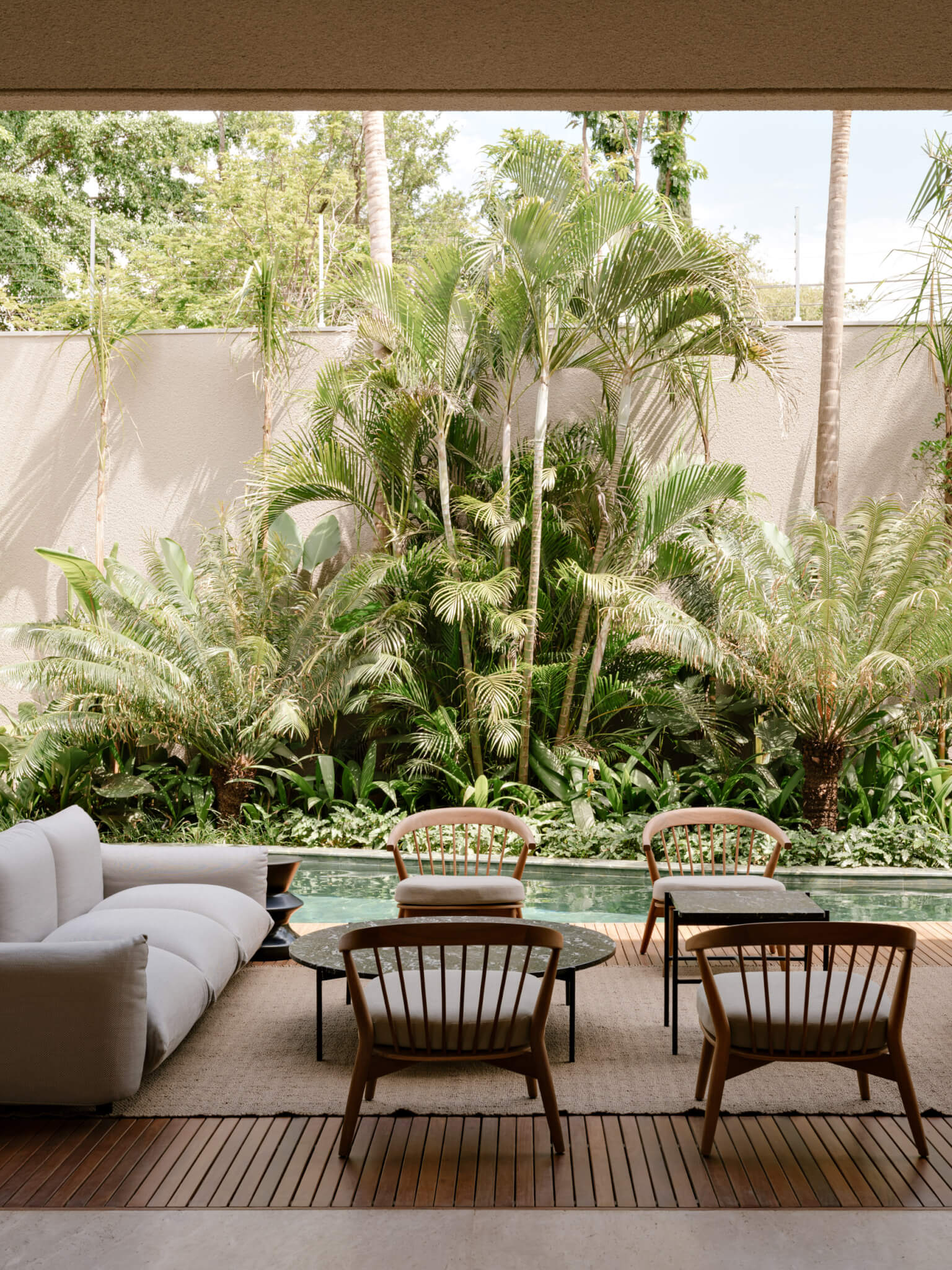 Na varanda, a área de convívio com churrasqueira é um convite ao encontro e ao desfrute ao ar livre. A visão se projeta para um muro verde ao fundo, envolto por vegetação tropical, compondo uma moldura viva que amplia o jardim principal. A piscina, com traçado orgânico, rompe com a ortogonalidade da arquitetura e cria um contraponto delicado às linhas retas da volumetria. Revestida com quartzito Vitória Régia — pedra natural brasileira de tonalidade verde vibrante —, a piscina reforça o caráter tropical e sensorial do projeto.