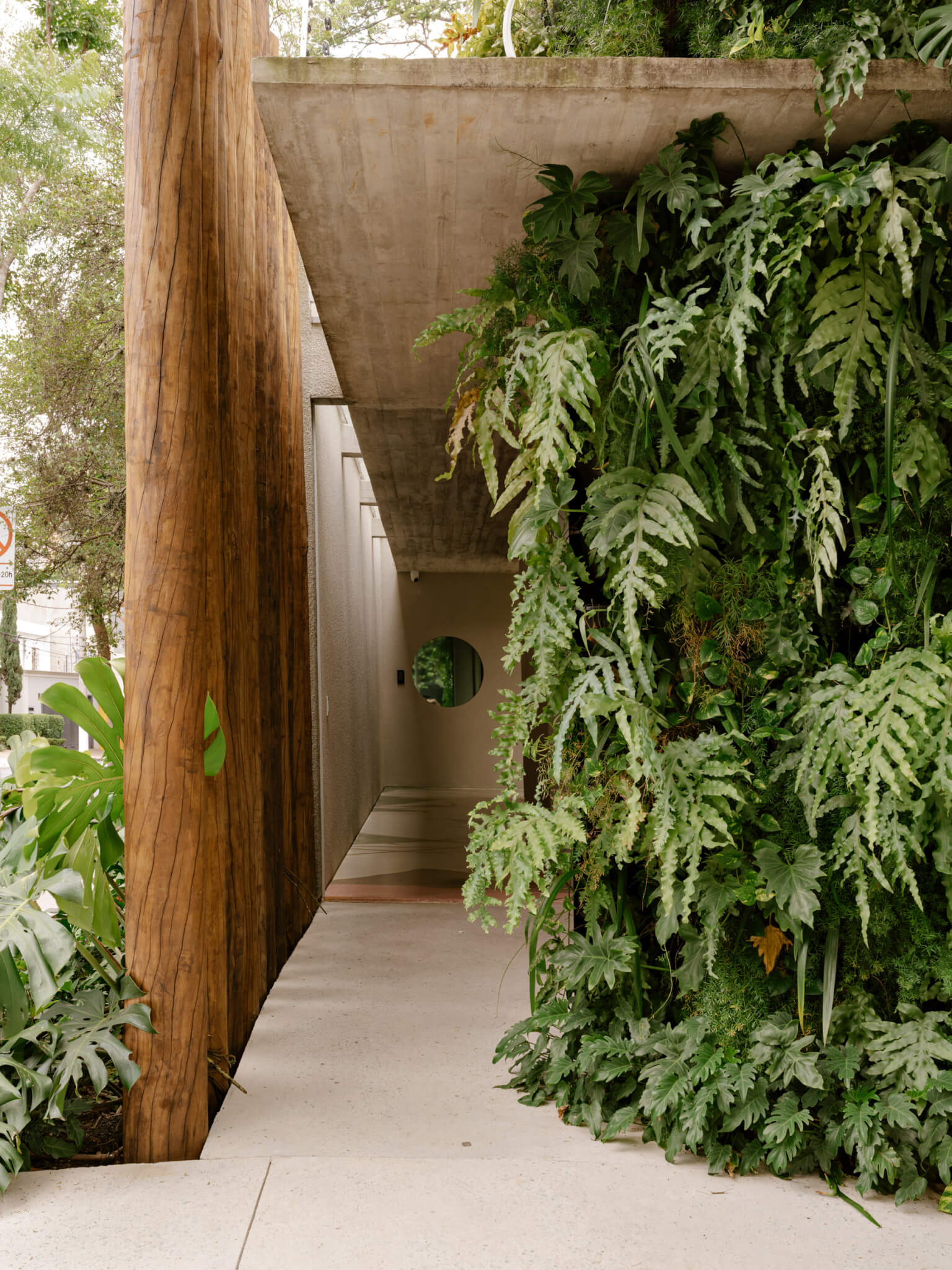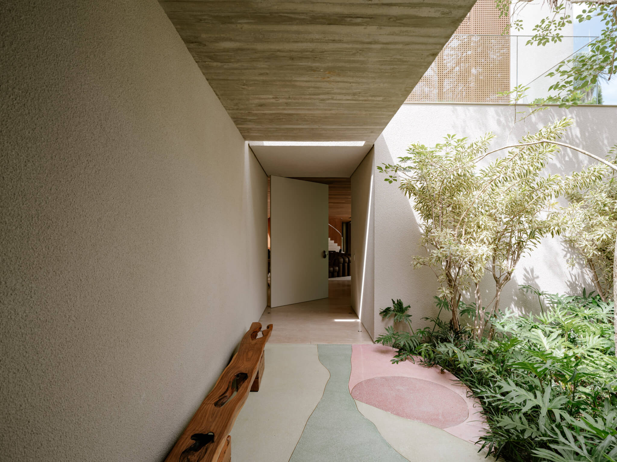 A entrada da residência se dá por uma galeria linear que atua como zona de transição entre o espaço público e o universo íntimo da casa. Ali, troncos de madeira criam um ritmo vertical suave, envolto por um jardim tropical e um muro verde. A cobertura de concreto aparente, ligeiramente afastada do muro lindeiro, permite a entrada delicada da luz natural, que desenha fendas de claridade ao longo do percurso. No piso, uma intervenção em tons de rosa e azul adiciona uma camada artística ao espaço, reforçando sua atmosfera contemplativa.