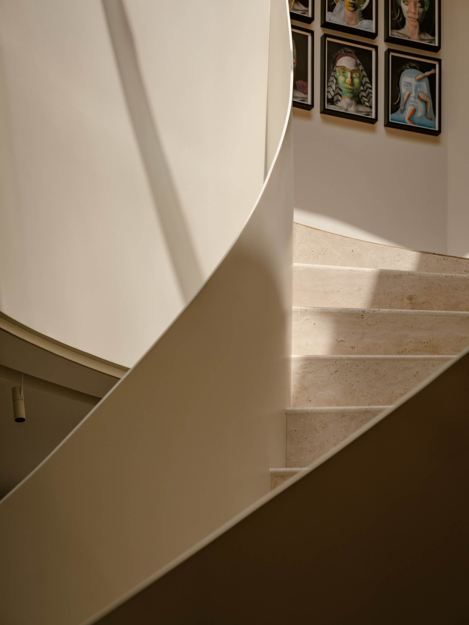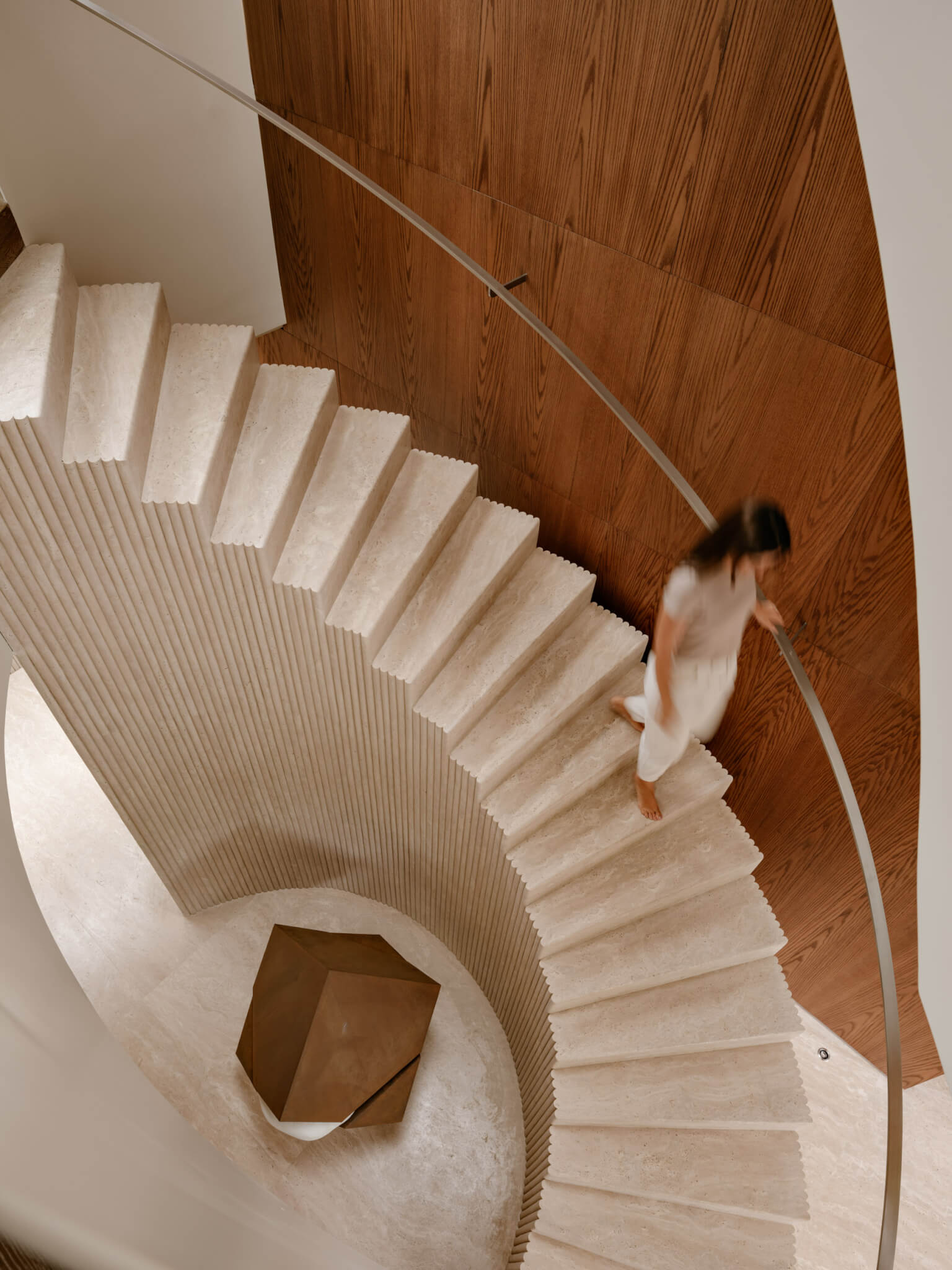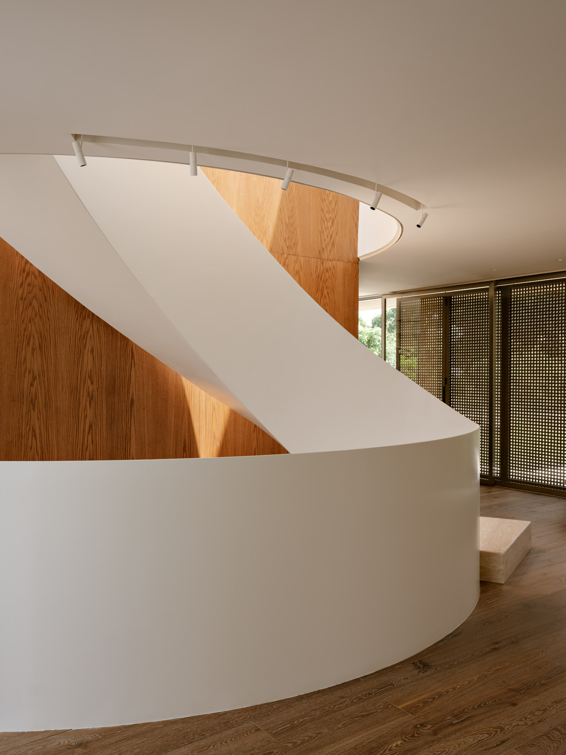 Nesta casa, a escada é um elemento escultórico que conduz a uma experiência tátil e sensorial. À medida que se percorre o lance, novas perspectivas do espaço se revelam, reforçadas por uma claraboia de forma orgânica que derrama luz natural sobre as superfícies. Essa luz revela texturas de madeira e pedra, destacando as formas e proporções com suavidade ao longo do dia.