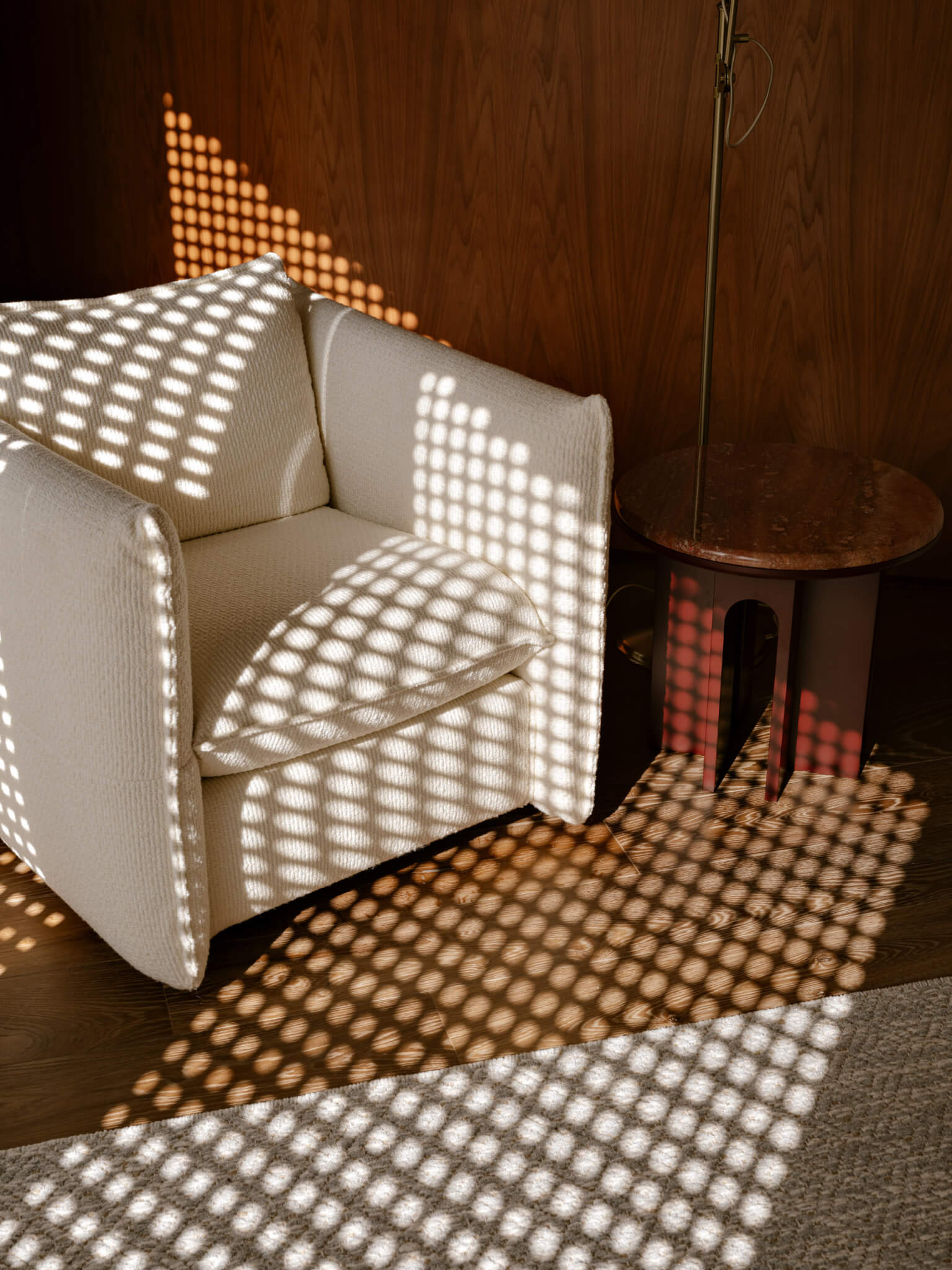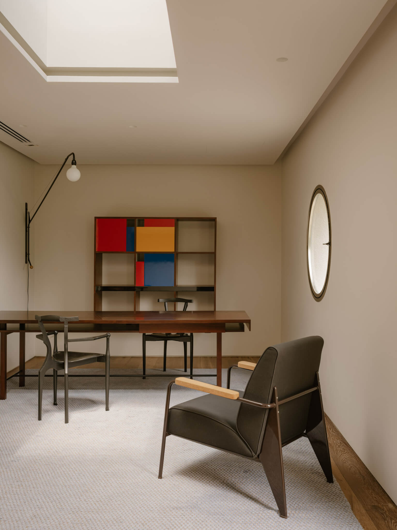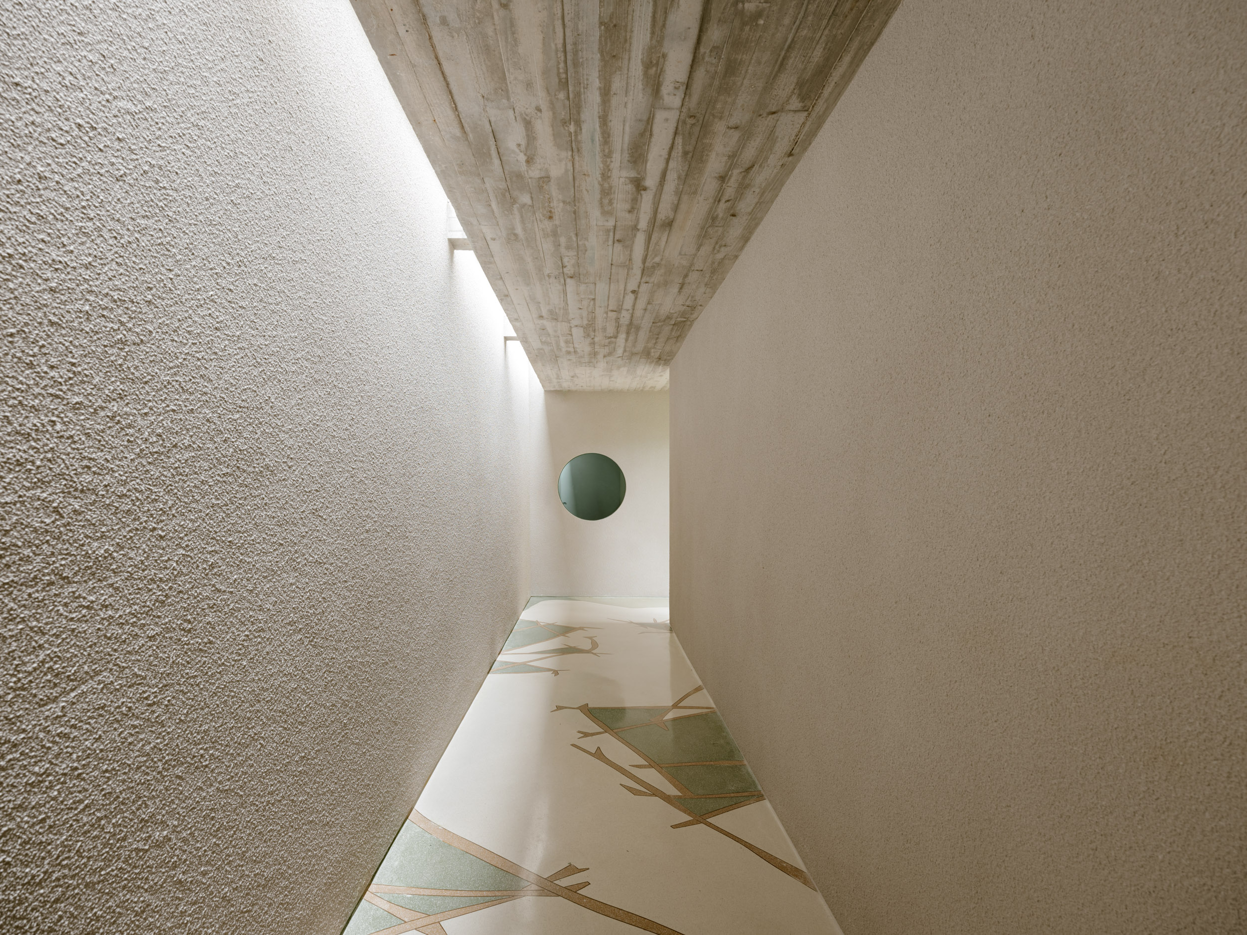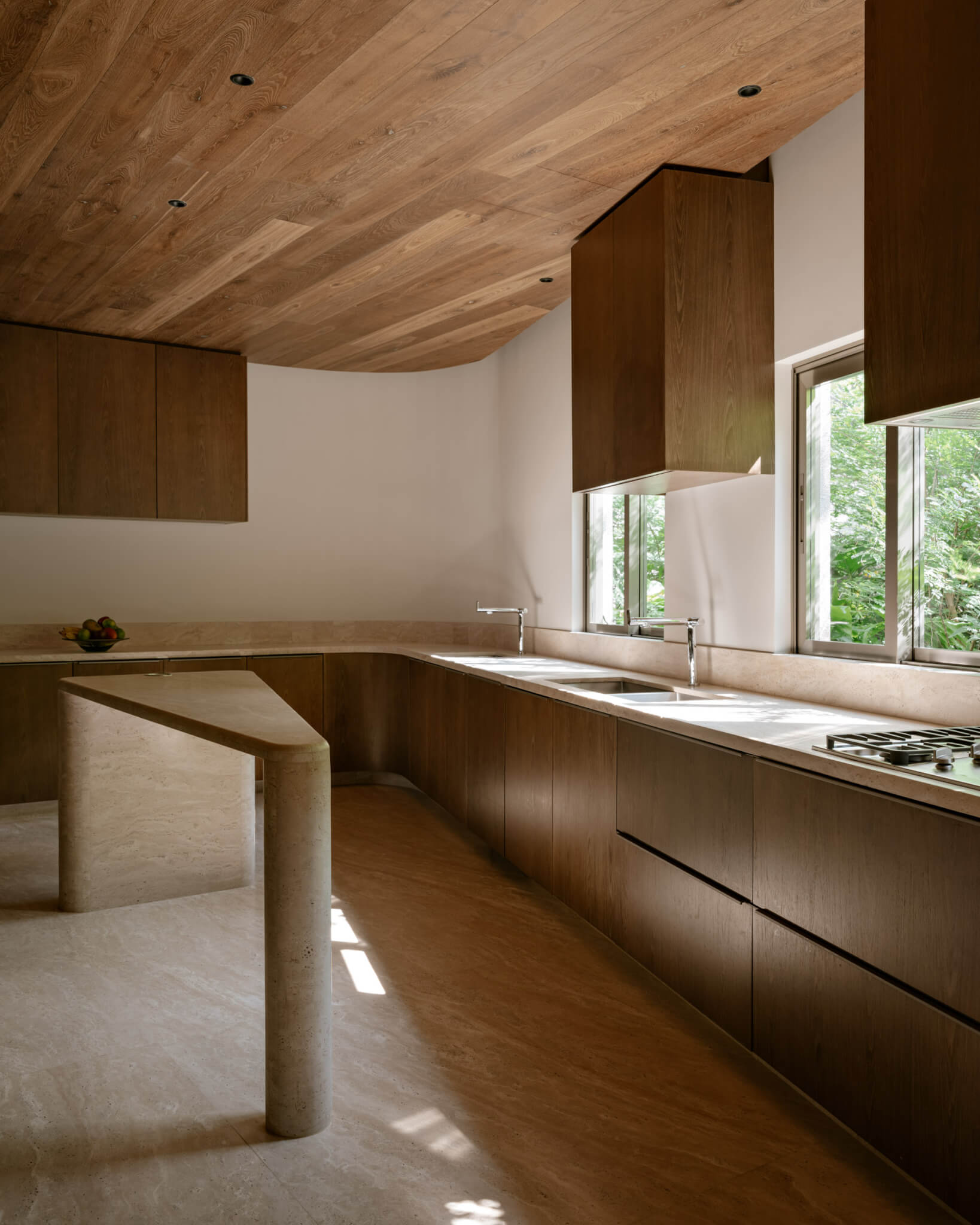 Nesta casa, a escada é um elemento escultórico que conduz a uma experiência tátil e sensorial. À medida que se percorre o lance, novas perspectivas do espaço se revelam, reforçadas por uma claraboia de forma orgânica que derrama luz natural sobre as superfícies. Essa luz revela texturas de madeira e pedra, destacando as formas e proporções com suavidade ao longo do dia.
