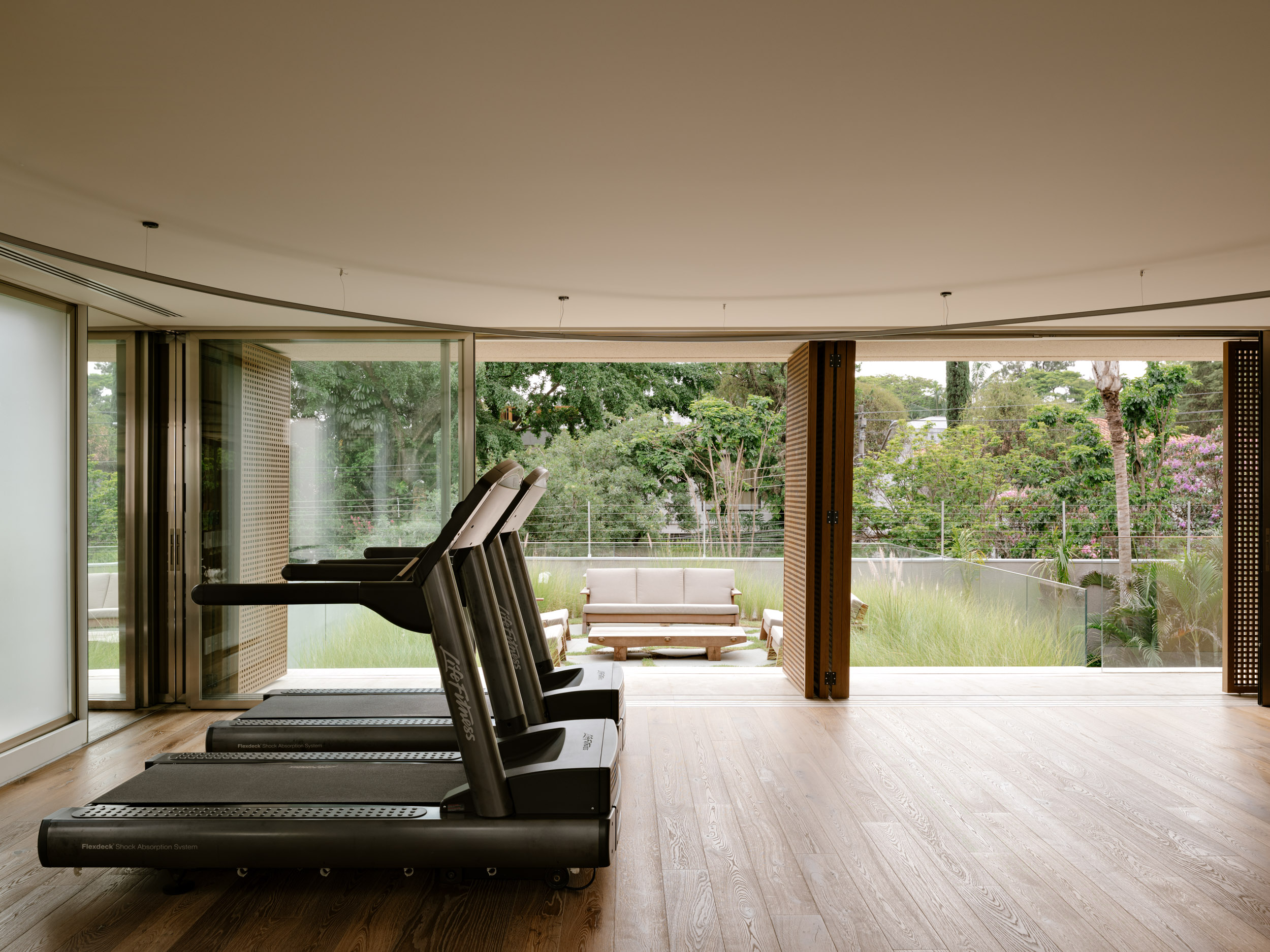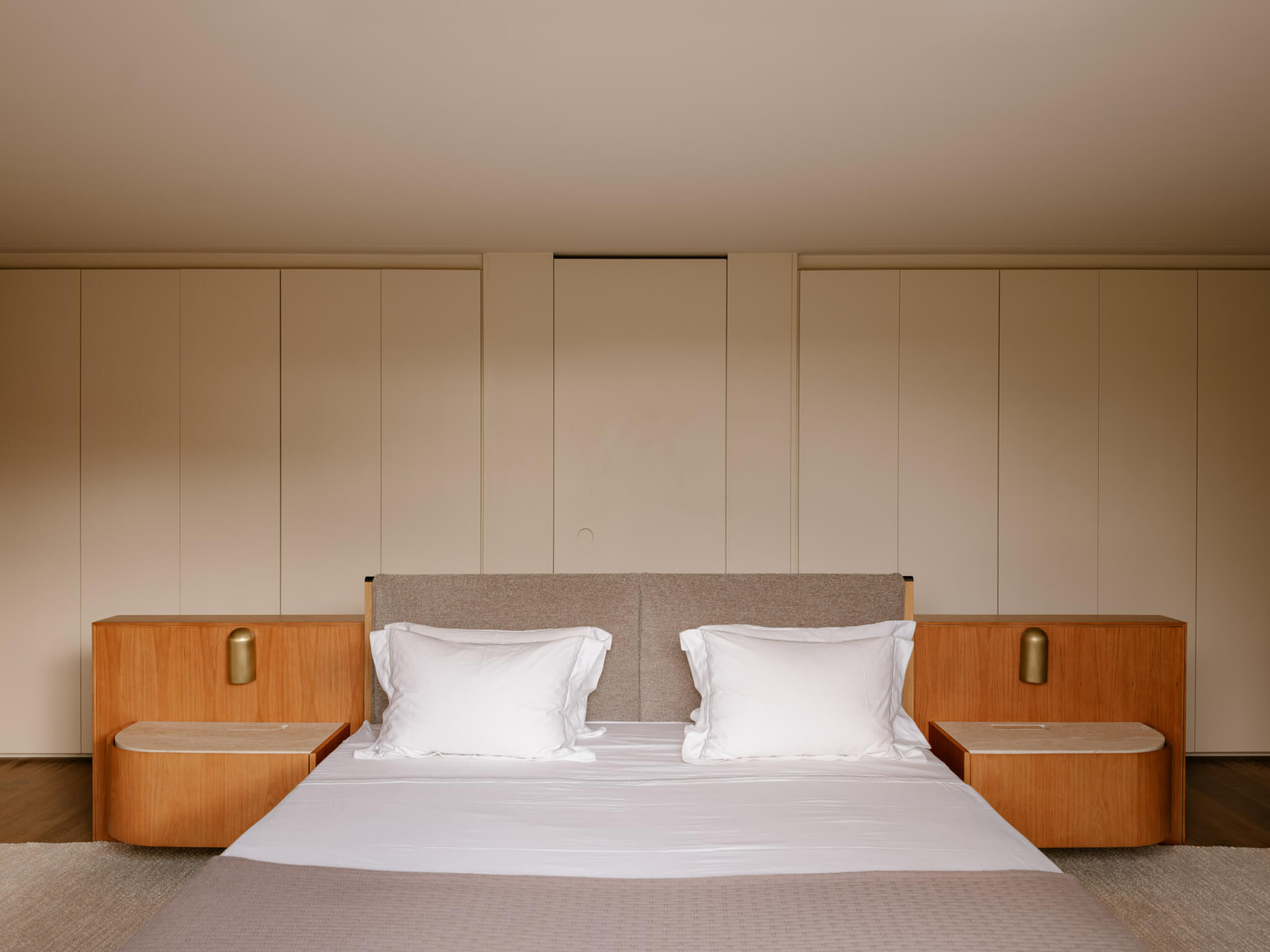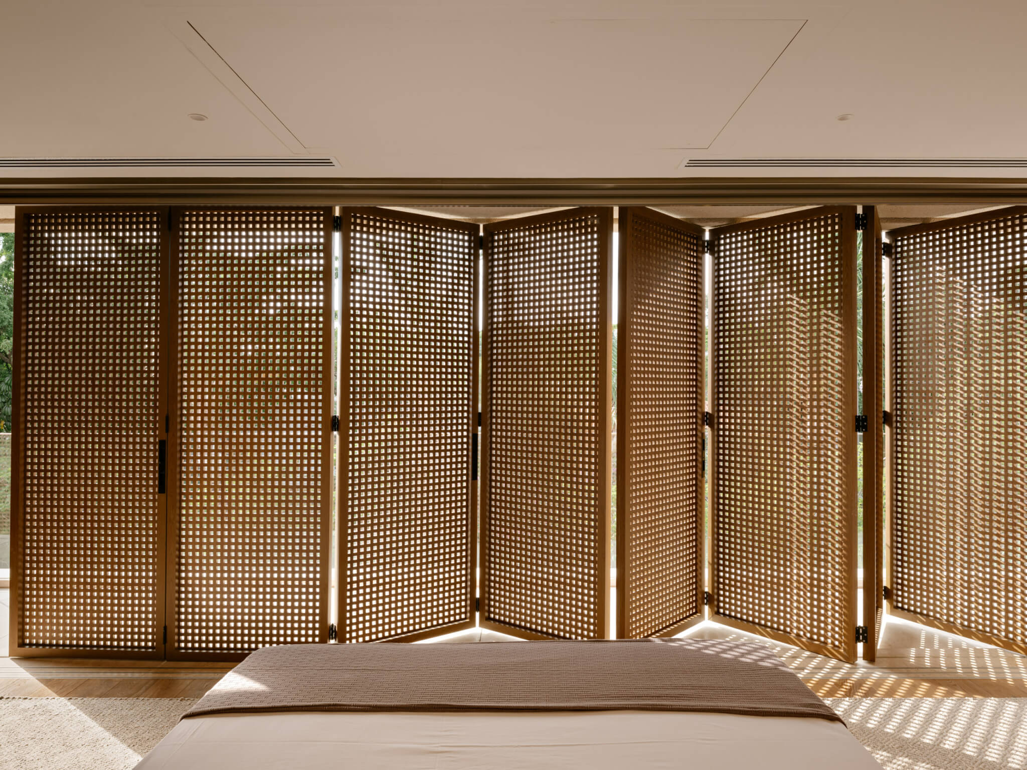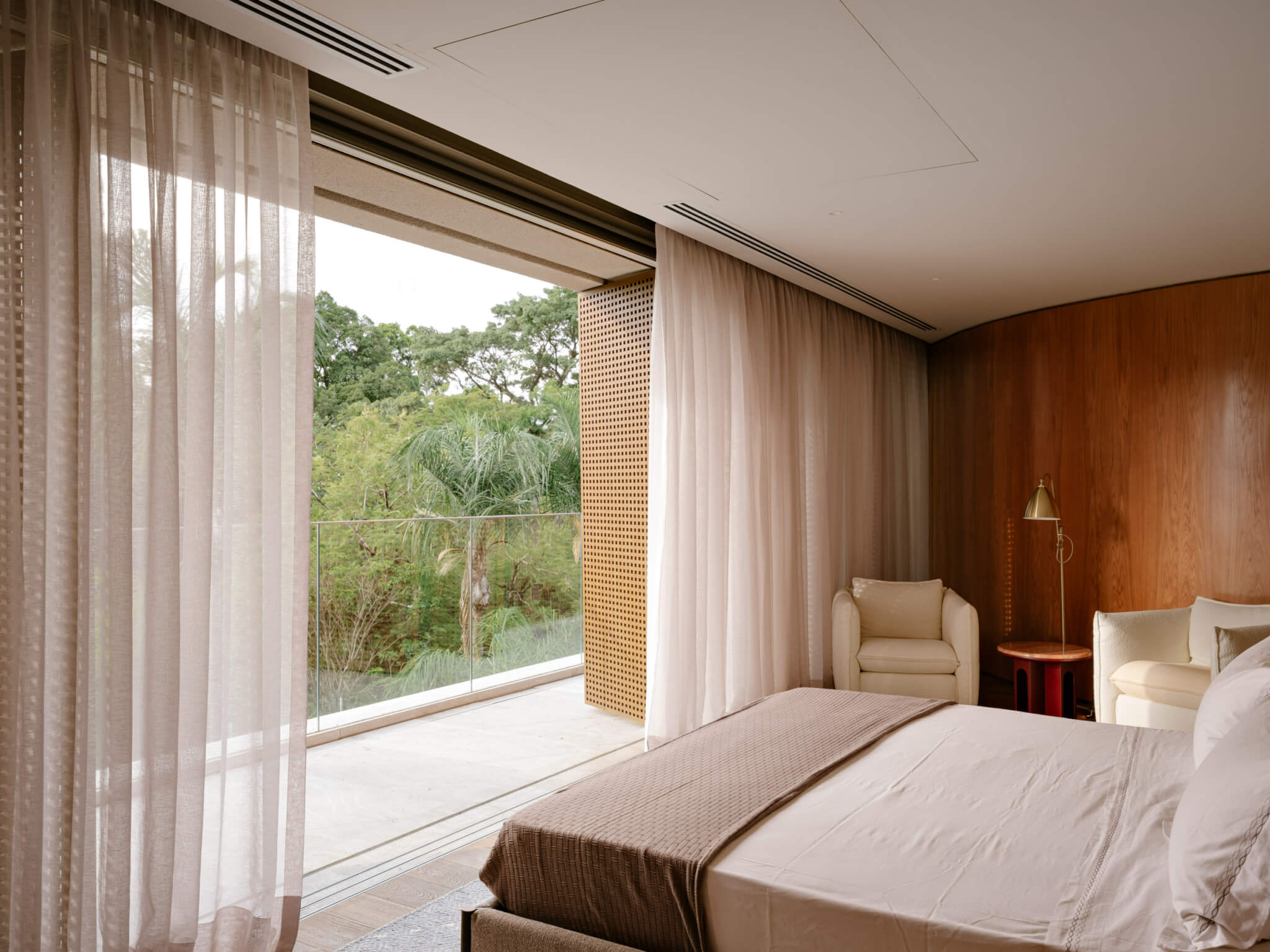 No pavimento superior estão localizados os dormitórios, academia, escritório e áreas de apoio. A suíte master é composta por camadas que equilibram transparência, controle solar e acústico: painéis treliçados, cortinas blackout, caixilhos de vidro duplo. Essa estrutura permite ajustar o nível de abertura e contemplação, promovendo um ambiente versátil e sereno. A luz desenha sombras mutáveis ao longo do dia, filtradas pelos brises em constante movimento.