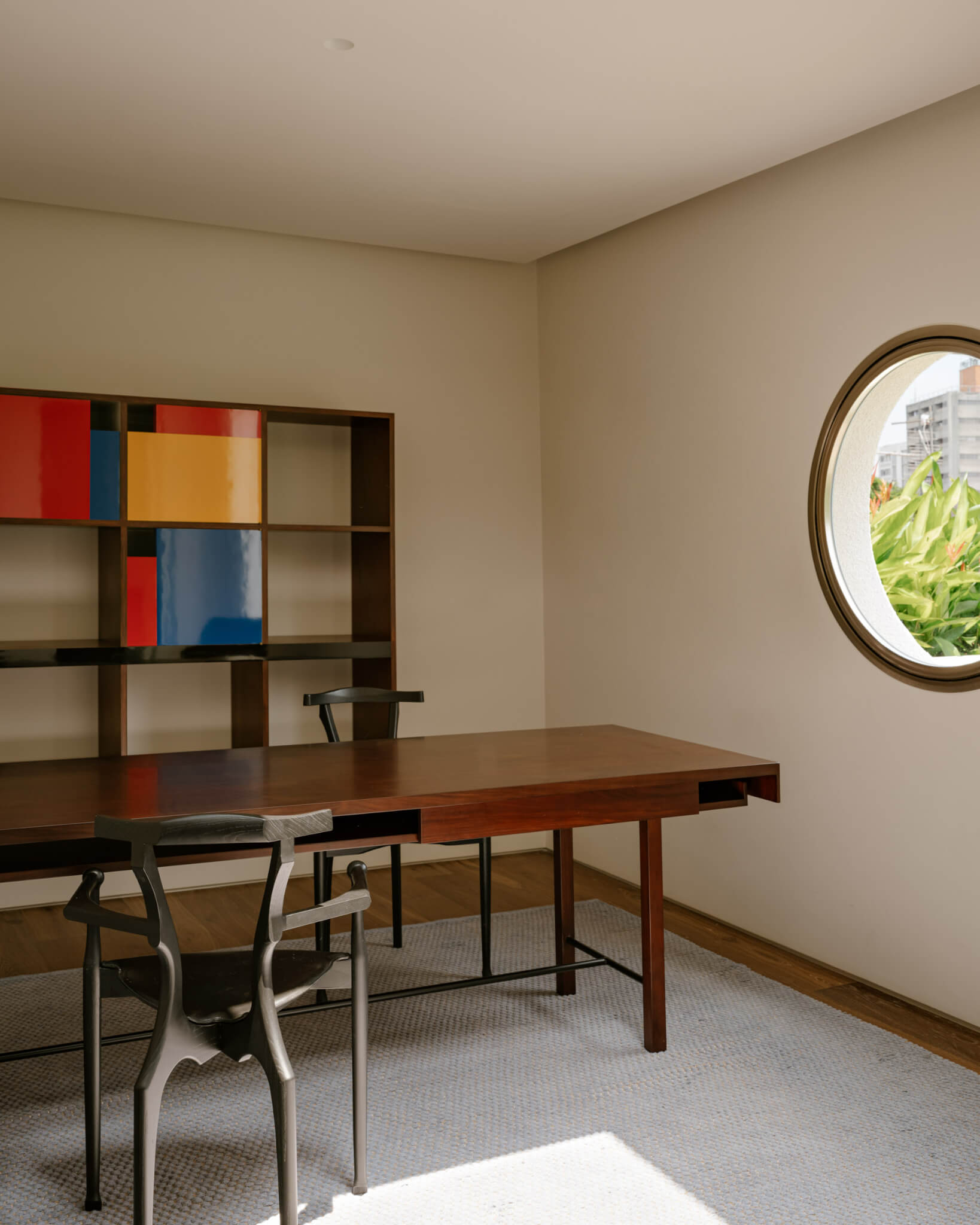 Na sala de jantar, a mesa Tradição, do Studio MK27 (Maad Collection), é acompanhada por cadeiras Softshell, de Ronan & Erwan Bouroullec (Vitra), e pelas icônicas Standard, de Jean Prouvé (Vitra), posicionadas nas cabeceiras. Acima, os pendentes PH Artichoke, de Poul Henningsen (Louis Poulsen), criam uma iluminação suave e escultural. Ao fundo, o buffet suspenso Cosmos, de Renata Correa (Maad Collection), se destaca sobre a parede de filetes de pedra iluminada por luz zenital. Todas as peças são fornecidas pela Micasa Brasil.