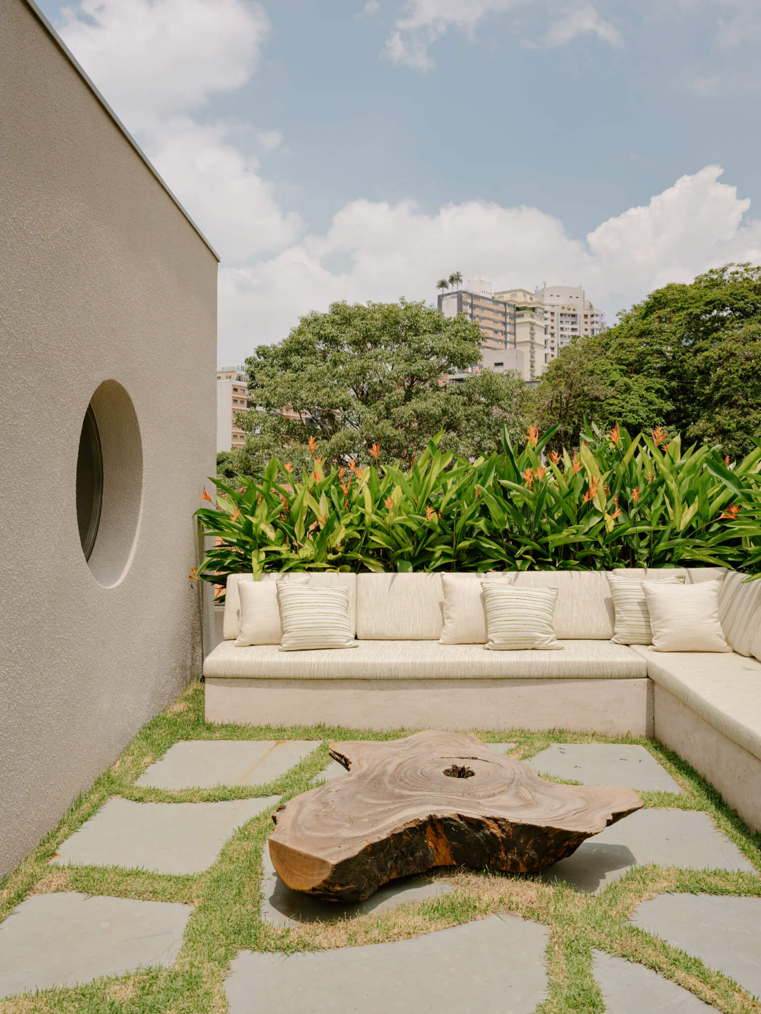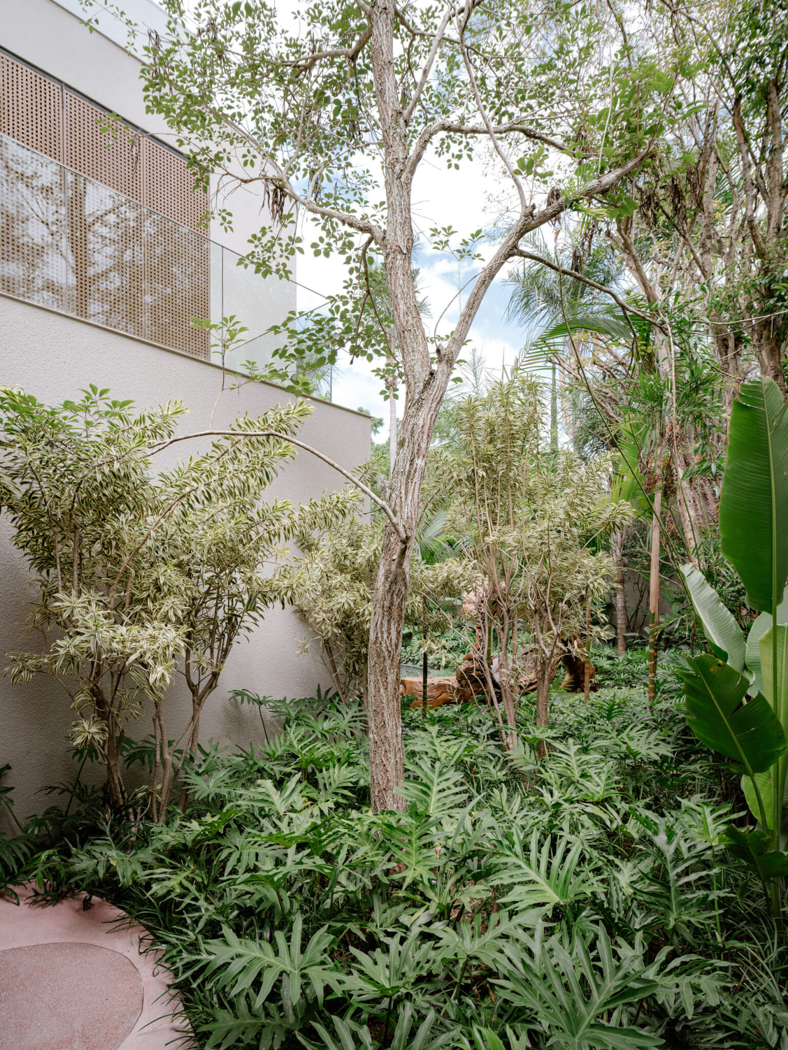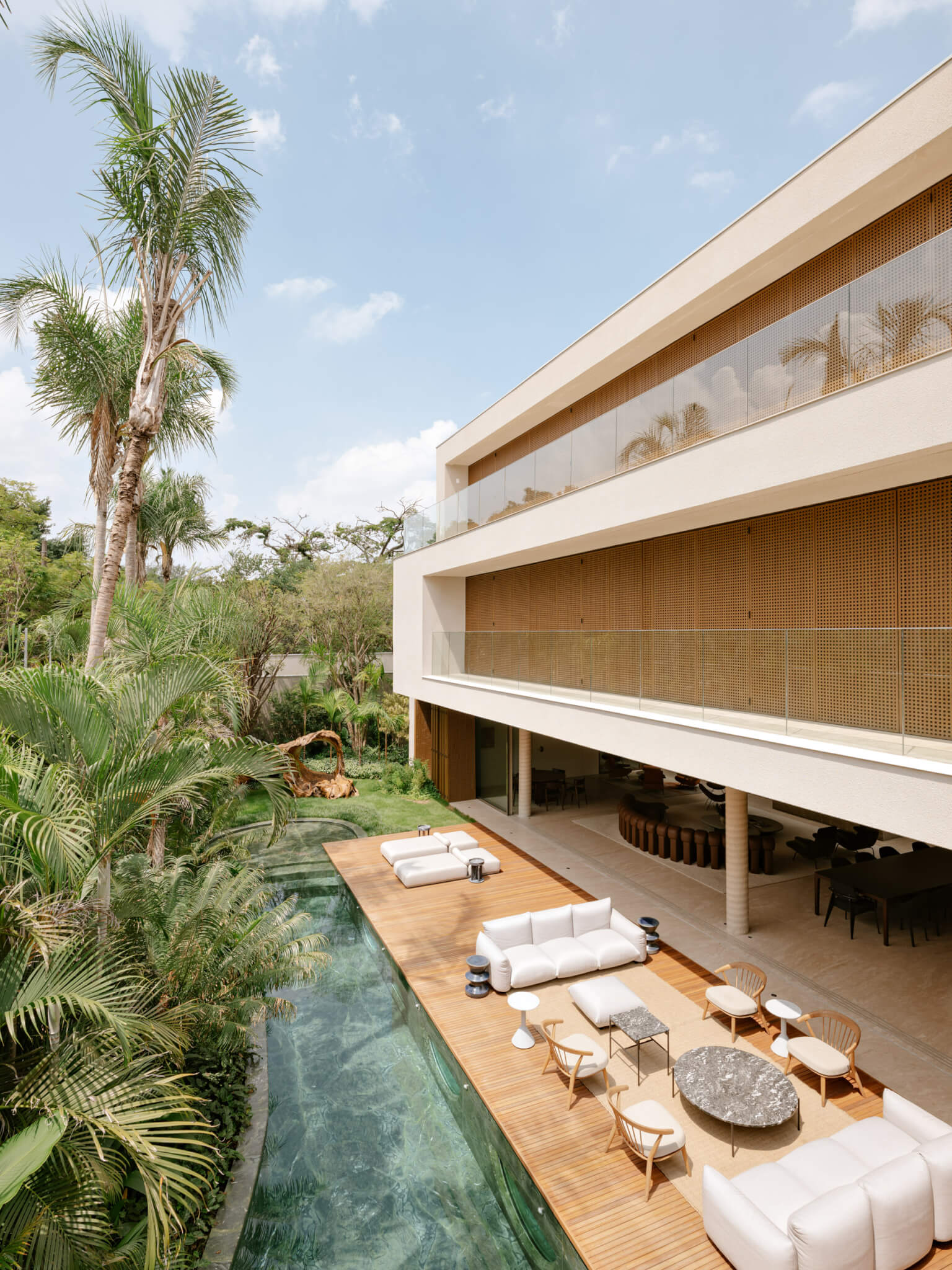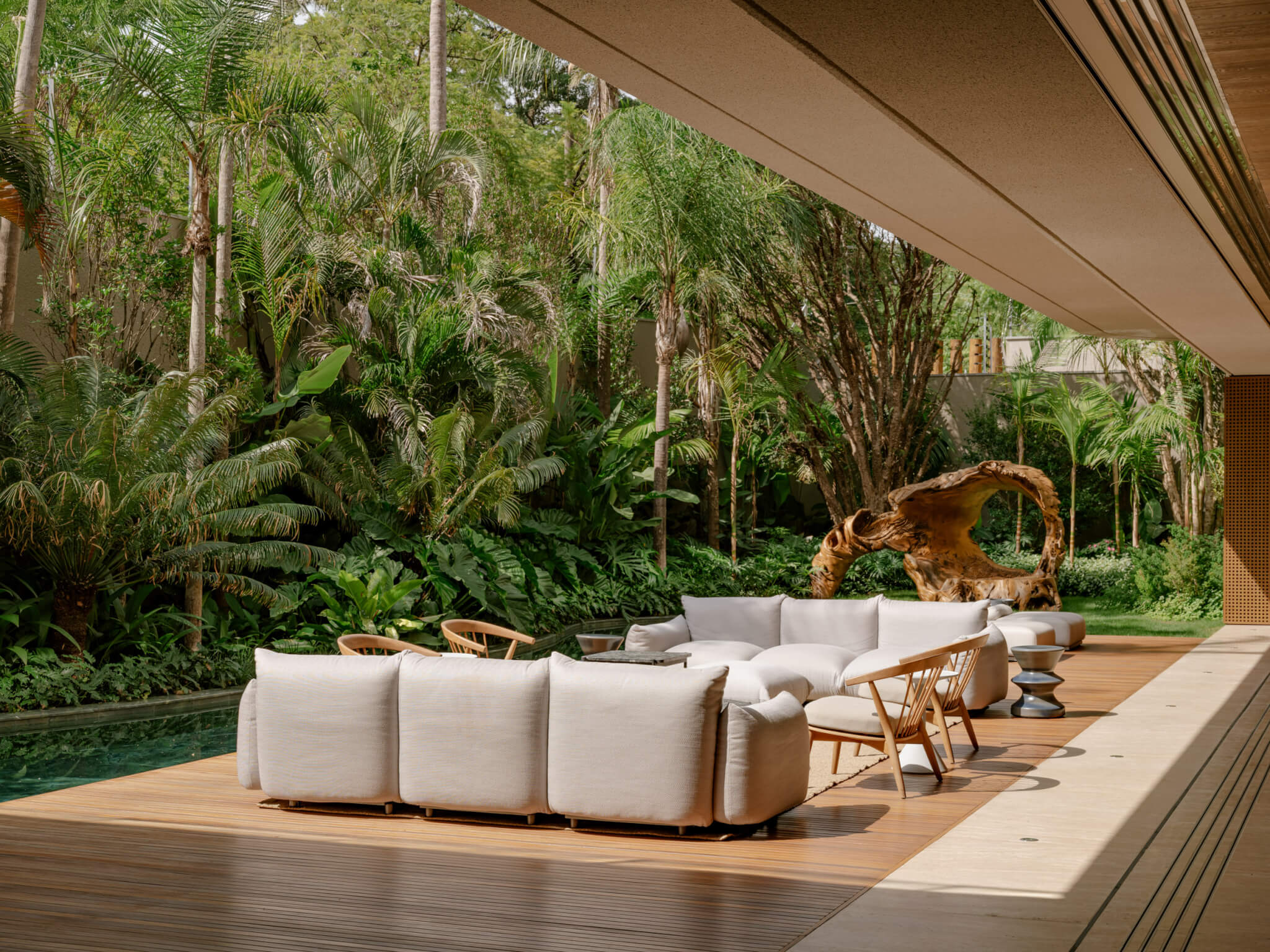 No terraço superior, a arquitetura se dissolve no paisagismo. Jardins implantados na laje e canteiros de flores tropicais percorrem a extensão da casa, criando um ambiente de contemplação e relaxamento. A academia se abre para uma varanda elevada à altura da copa das árvores, reforçando a integração sensorial com o entorno. Um lounge externo, com mobiliário assinado por Carlos Motta, convida à convivência sob o abrigo da vegetação.