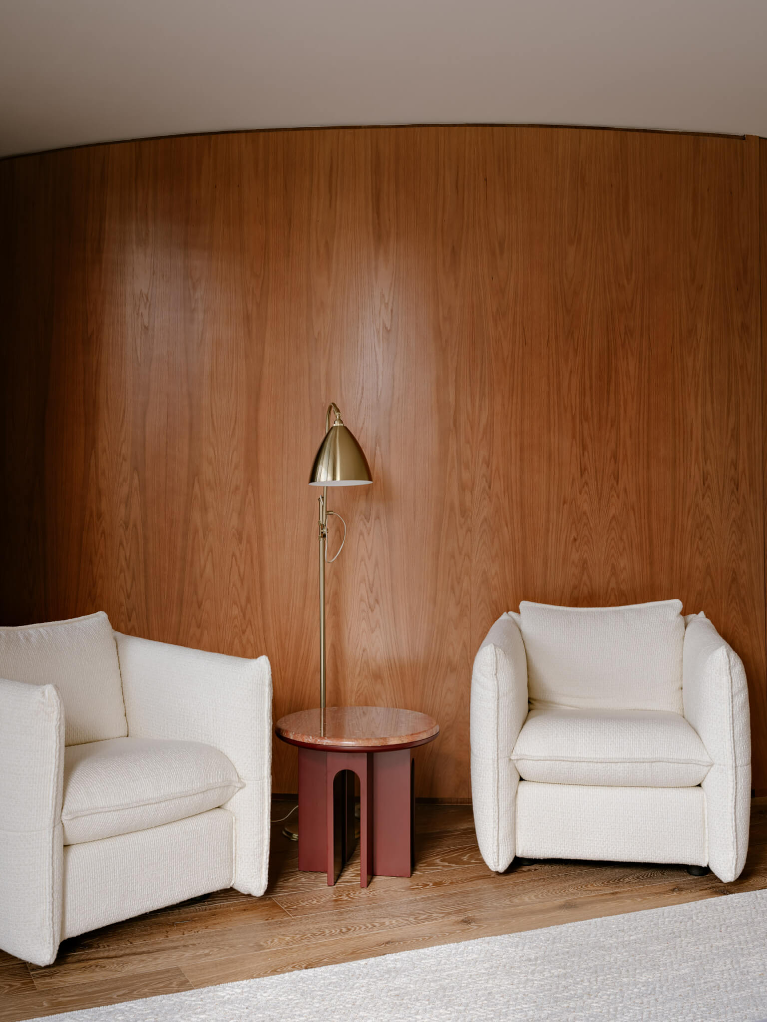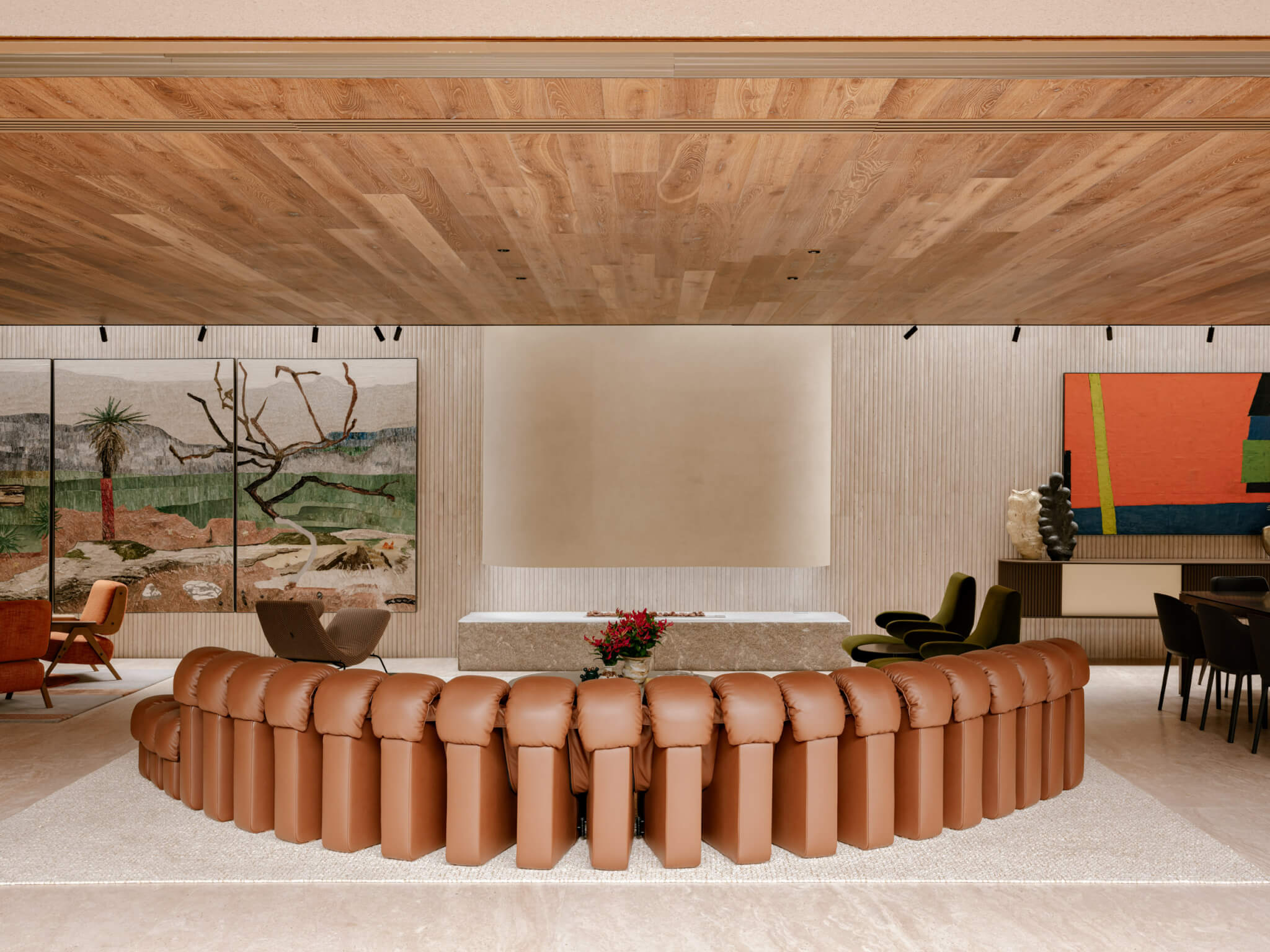A sala de estar é marcada por uma curadoria precisa de mobiliário moderno e contemporâneo. O sofá DS-600, criado por Ulrich Christian Berger (de Sede), é ladeado pelas poltronas Delfino, de Erberto Carboni (Arflex), e pela poltrona Reversível, de Martin Eisler (Tacchini). As mesas de centro Blast, de Ronald Sasson (Maad Collection), completam a composição. Ao lado da adega, um lounge com poltronas Lina, de Gianfranco Frattini (Tacchini), acolhe rodas de conversa, enquanto a parede ao fundo exibe uma obra site-specific de Bruno Weilemann Belo (Aura Galeria), inspirada nas xilogravuras japonesas Ukiyo-e.