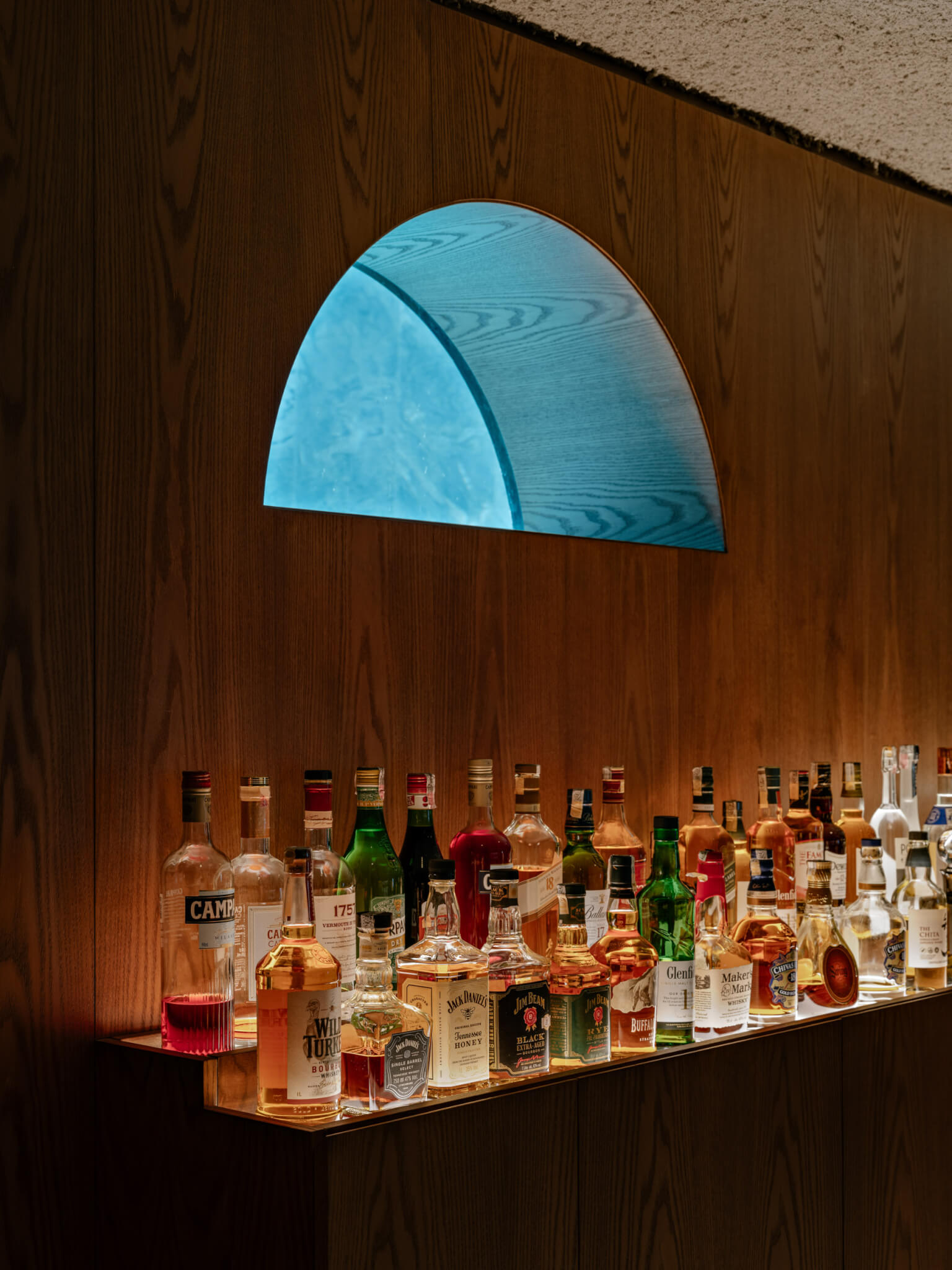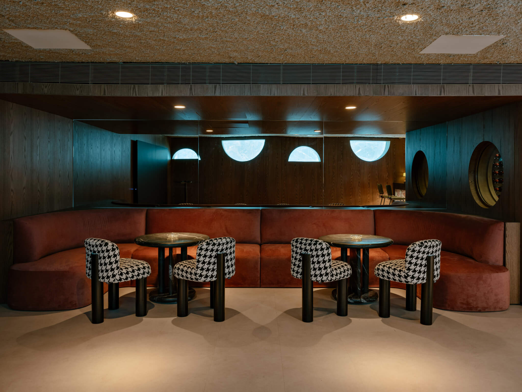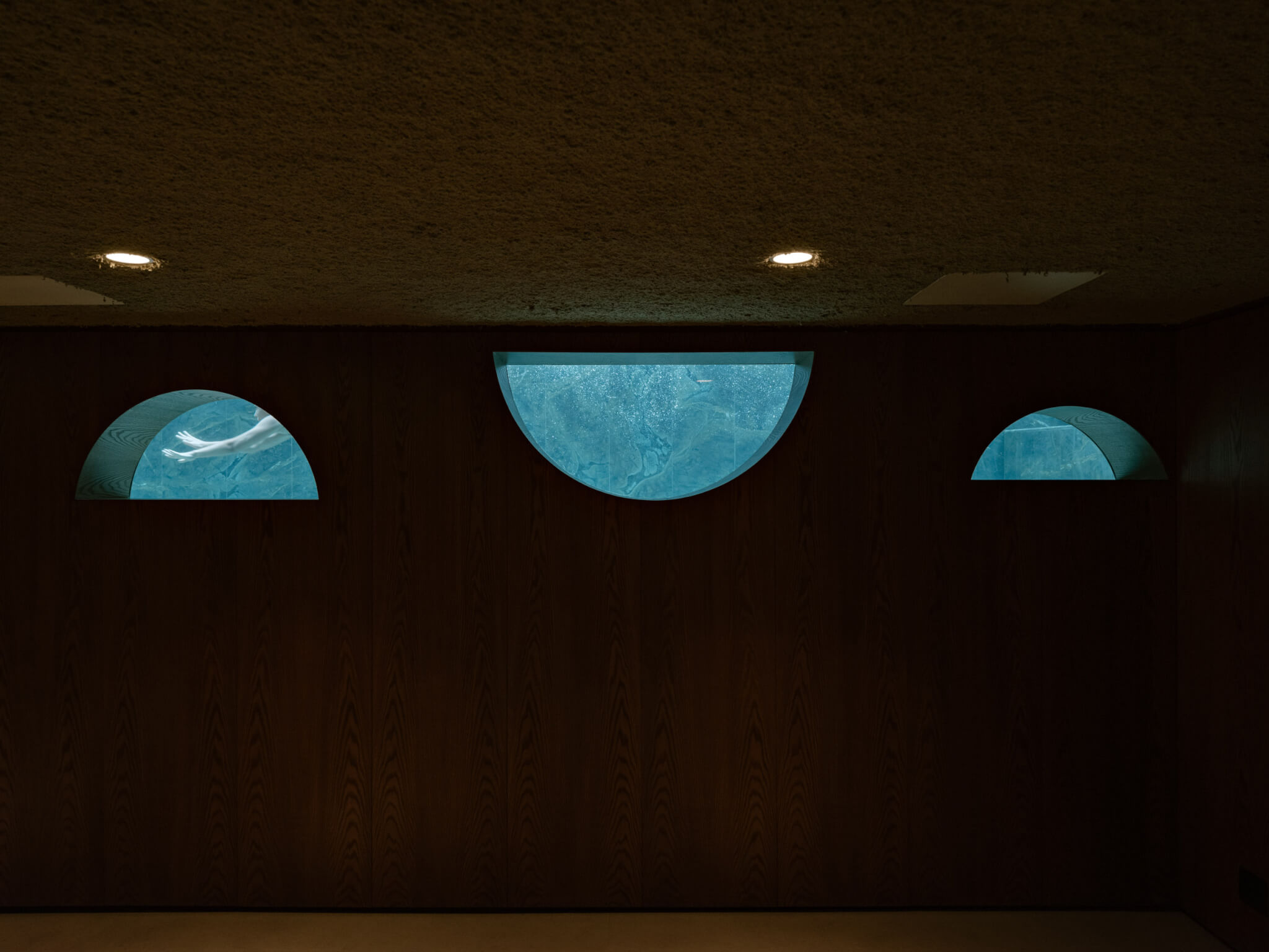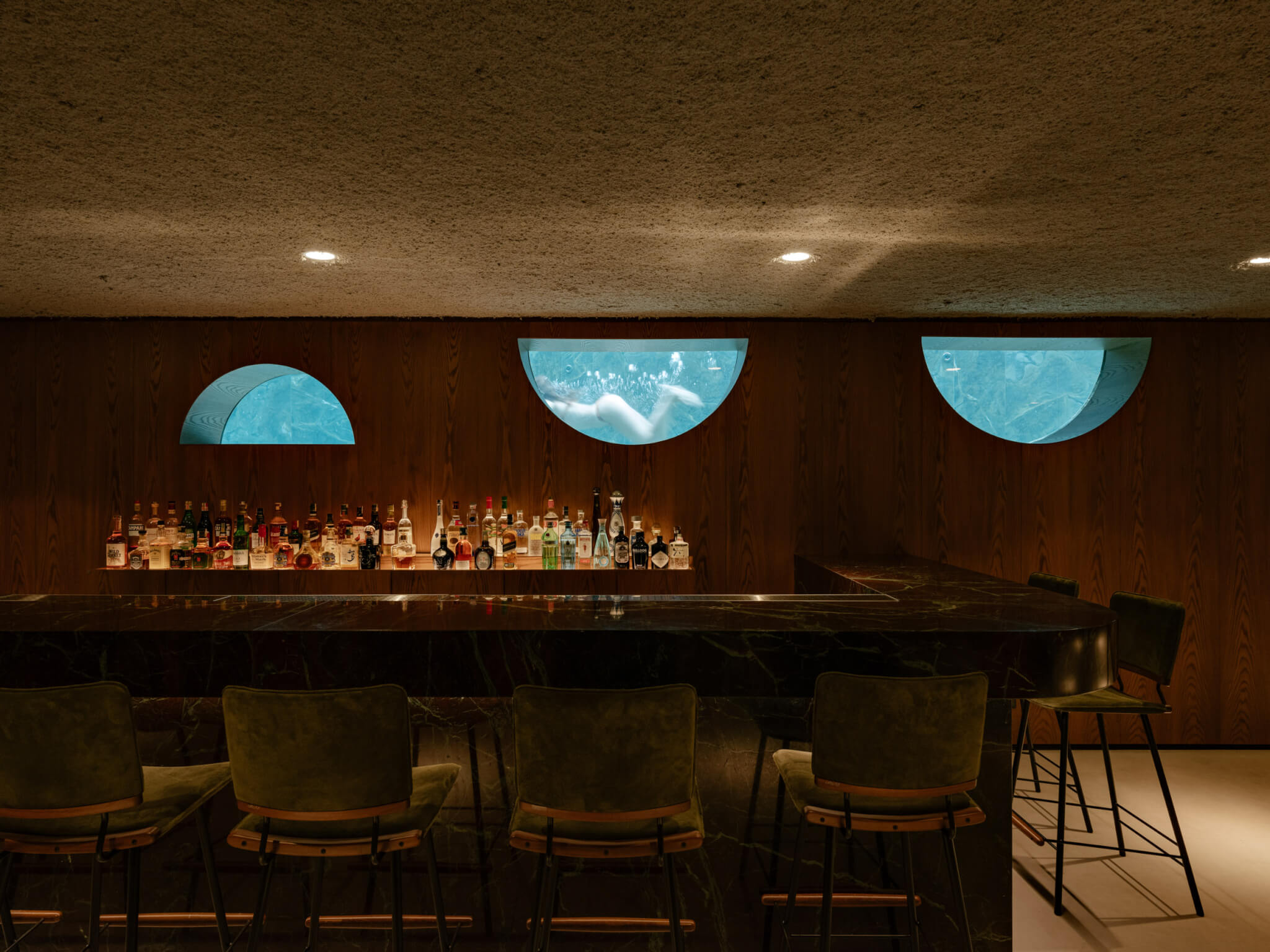 No subsolo, a discoteca reforça o vínculo entre arquitetura e paisagem. Visores semicirculares emolduram a vista da piscina, e a luz filtrada pela água gera um jogo dinâmico de sombras sobre a parede do bar. O ritmo visual criado por esses elementos cria uma atmosfera gráfica e envolvente, marcada por um design que valoriza a continuidade entre o dentro e o fora.