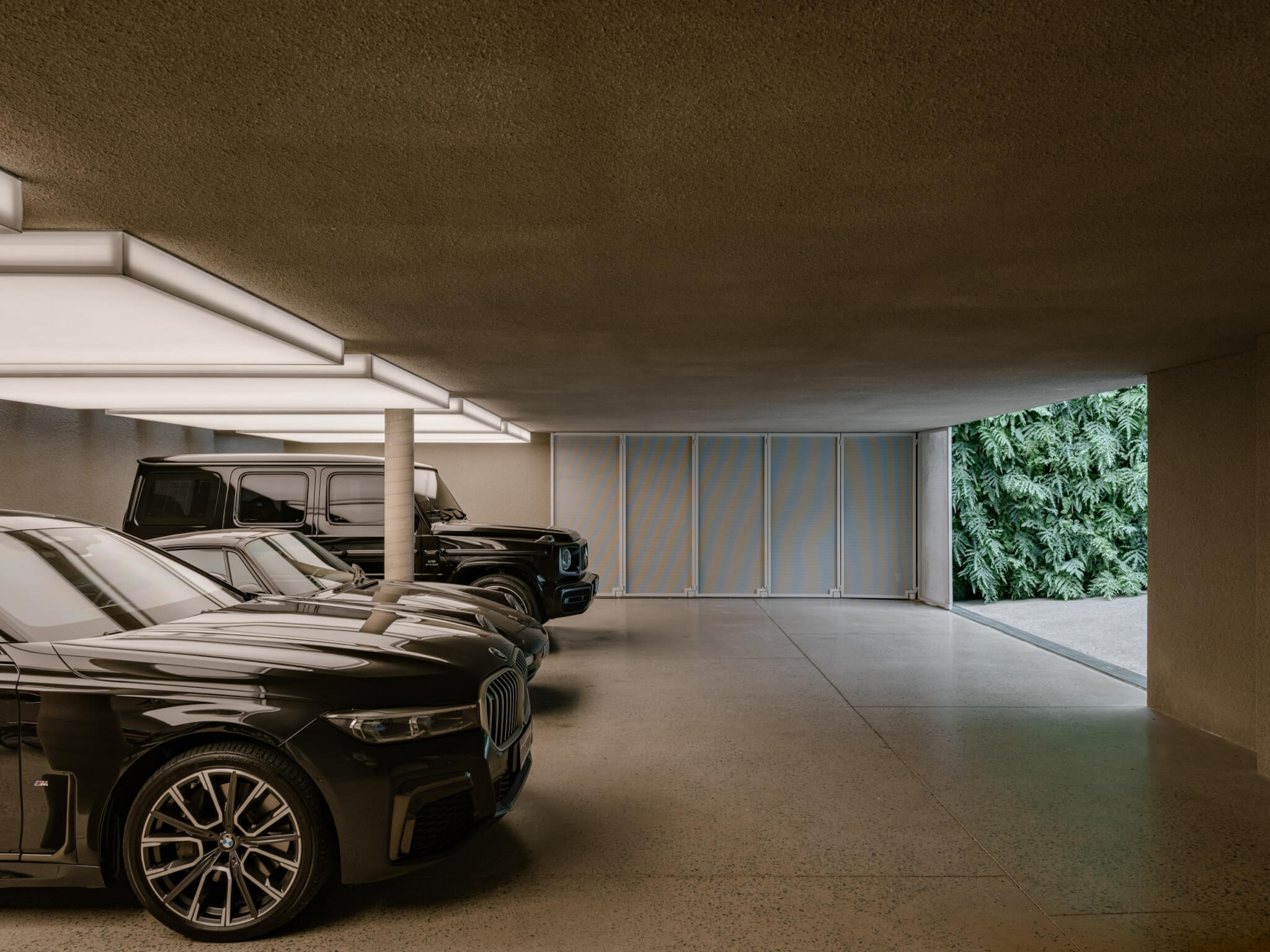 Na garagem, prismas de vidro leitoso transformam o espaço em uma espécie de galeria para os automóveis. À noite, a iluminação interna desses volumes cria uma ambientação etérea, valorizando o espaço de maneira inesperada.