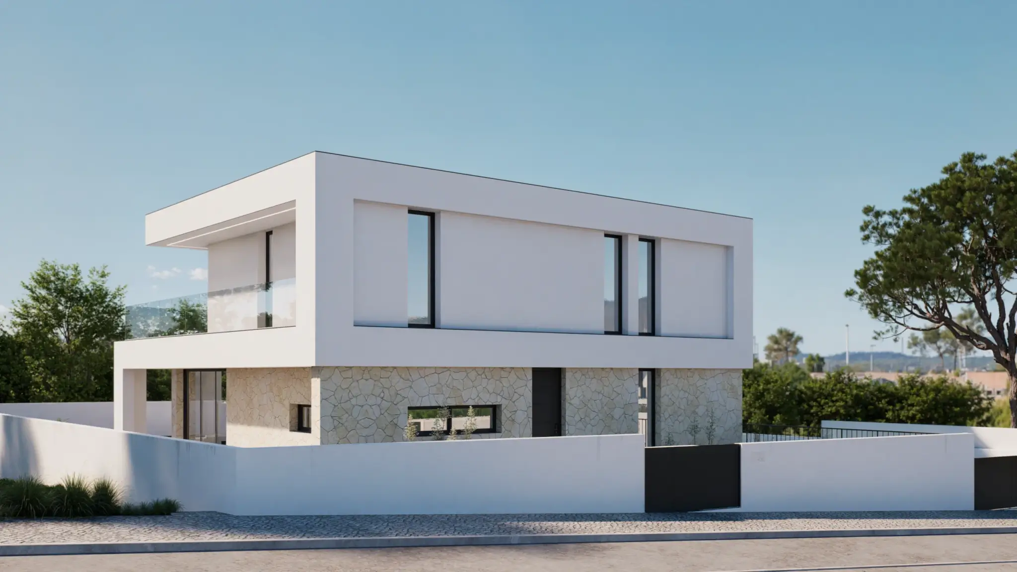 Através da interacção de dois volumes (para habitação e garagem) e de um jogo de planos, crámos um alçado cego – a norte, que não só permitirá maior privacidade à habitação, como consolidará o desenho e directrizes do alinhamento patente nas construções existentes.