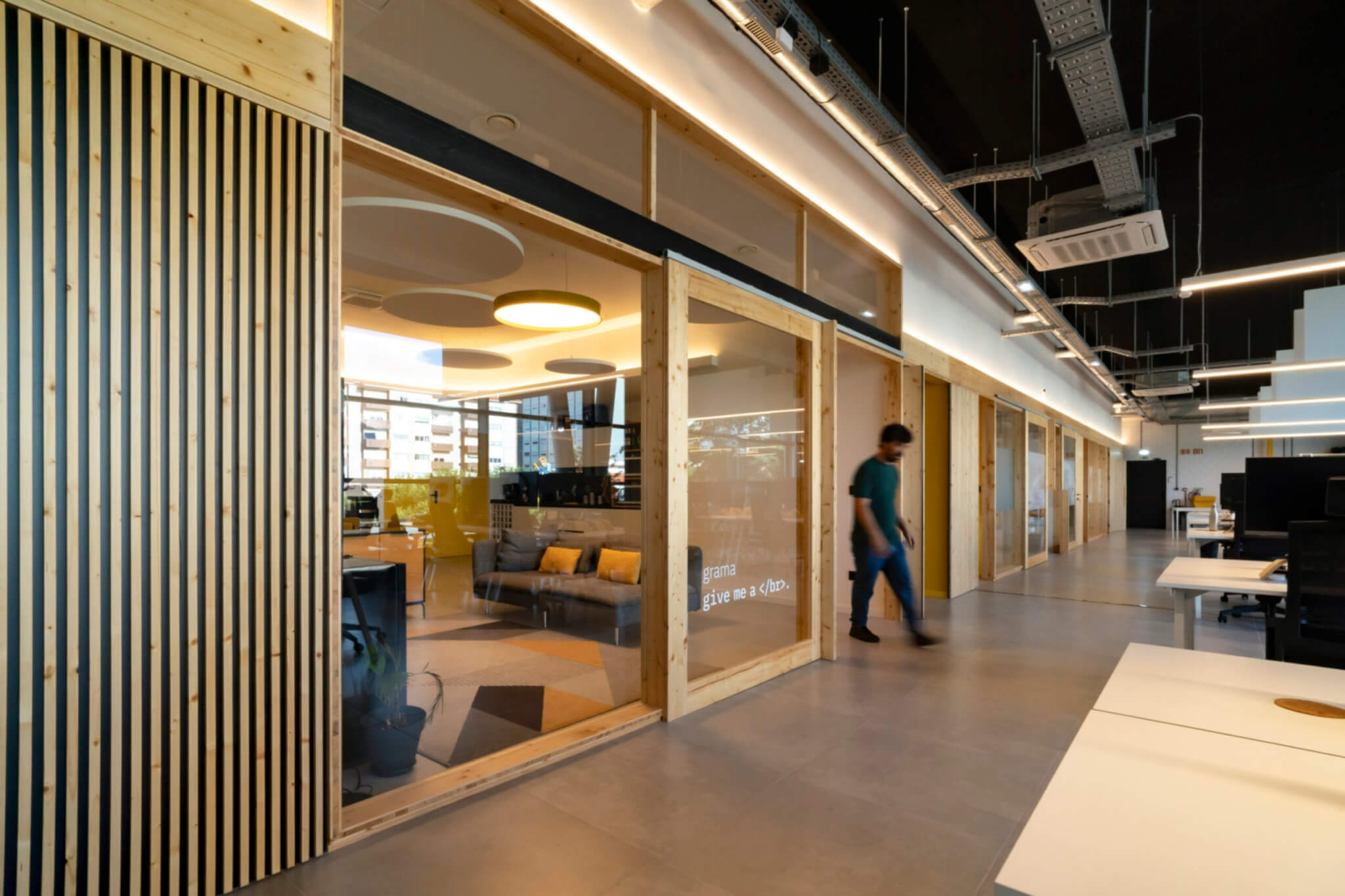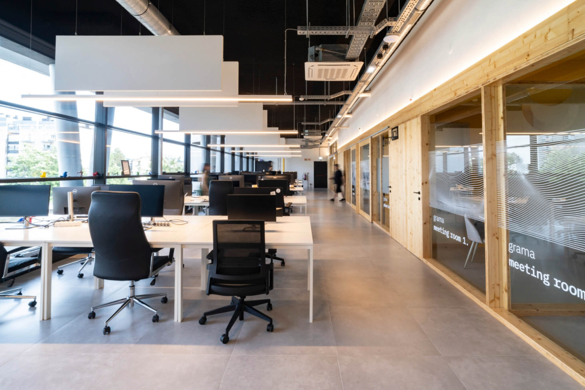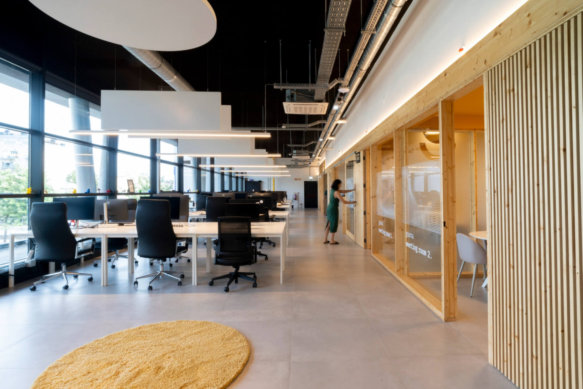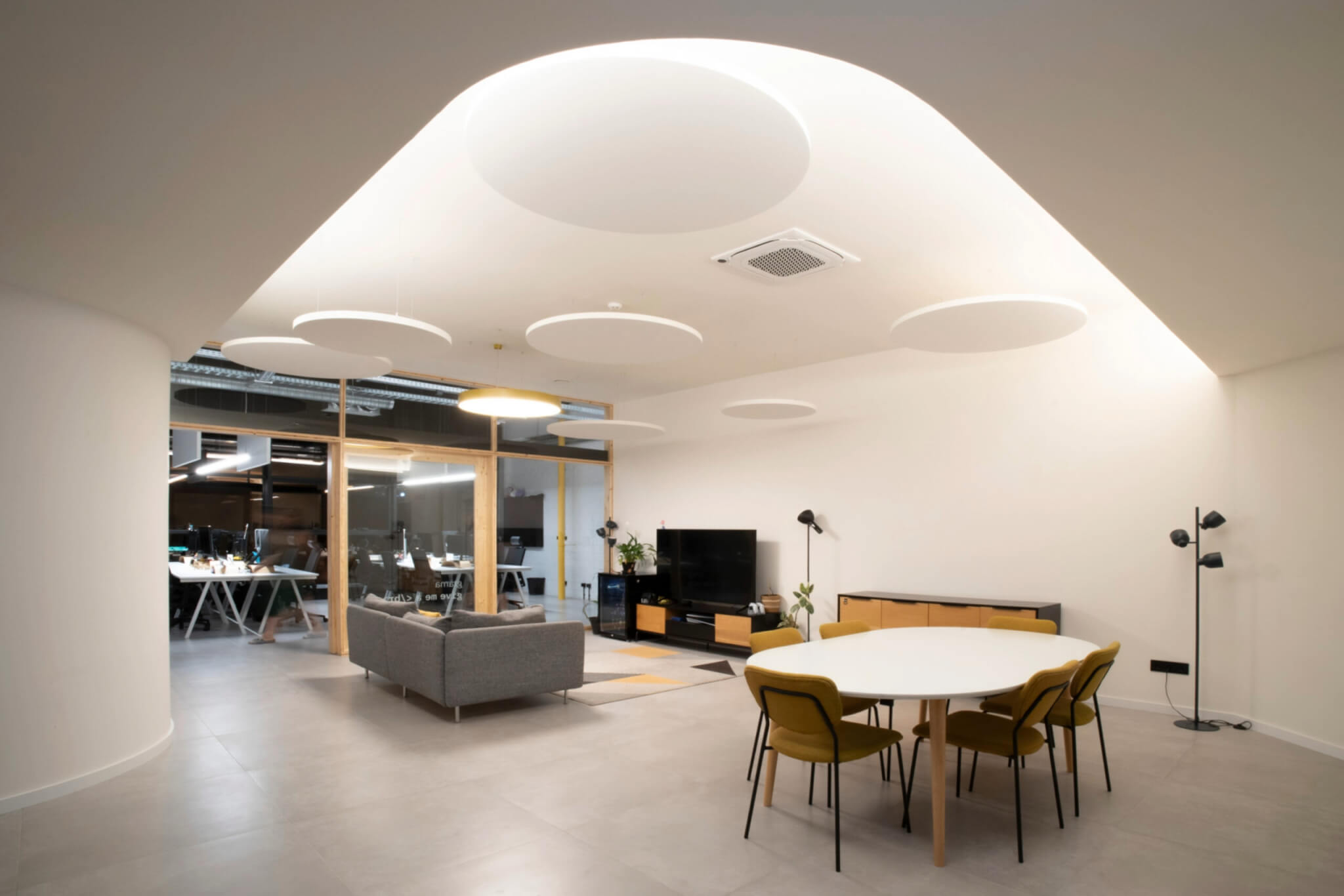 Neste sentido, podemos dizer que a abordagem design–build permitiu que as opções de projeto fossem avaliadas e ajustadas em tempo real, assegurando o alinhamento entre a intenção arquitetónica, a viabilidade técnica, os requisitos funcionais e as restrições orçamentais. Das diversas iterações com o cliente, num processo de ação–resposta , chegou-se a uma solução espacial flexível, suficientemente adaptável ao fluxo de trabalho da empresa e necessidade das equipas de desenvolvimento. As áreas de trabalho em open space constituem o núcleo da organização espacial, complementadas por salas de reunião fechadas, zonas informais de colaboração e outros espaços de apoio, utilizando a circulação como elemento organizador central, incentivando a interação e estruturando o programa global.