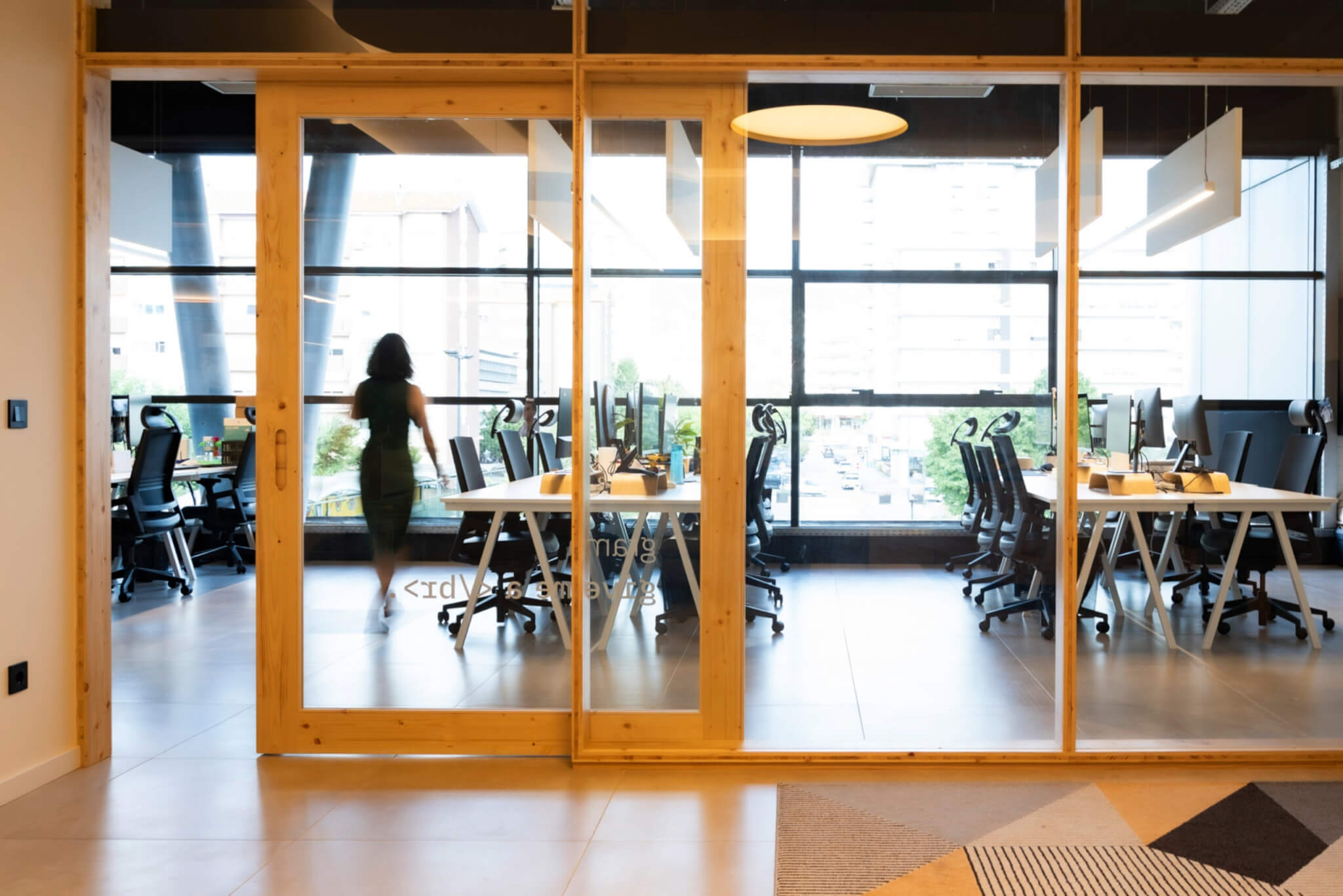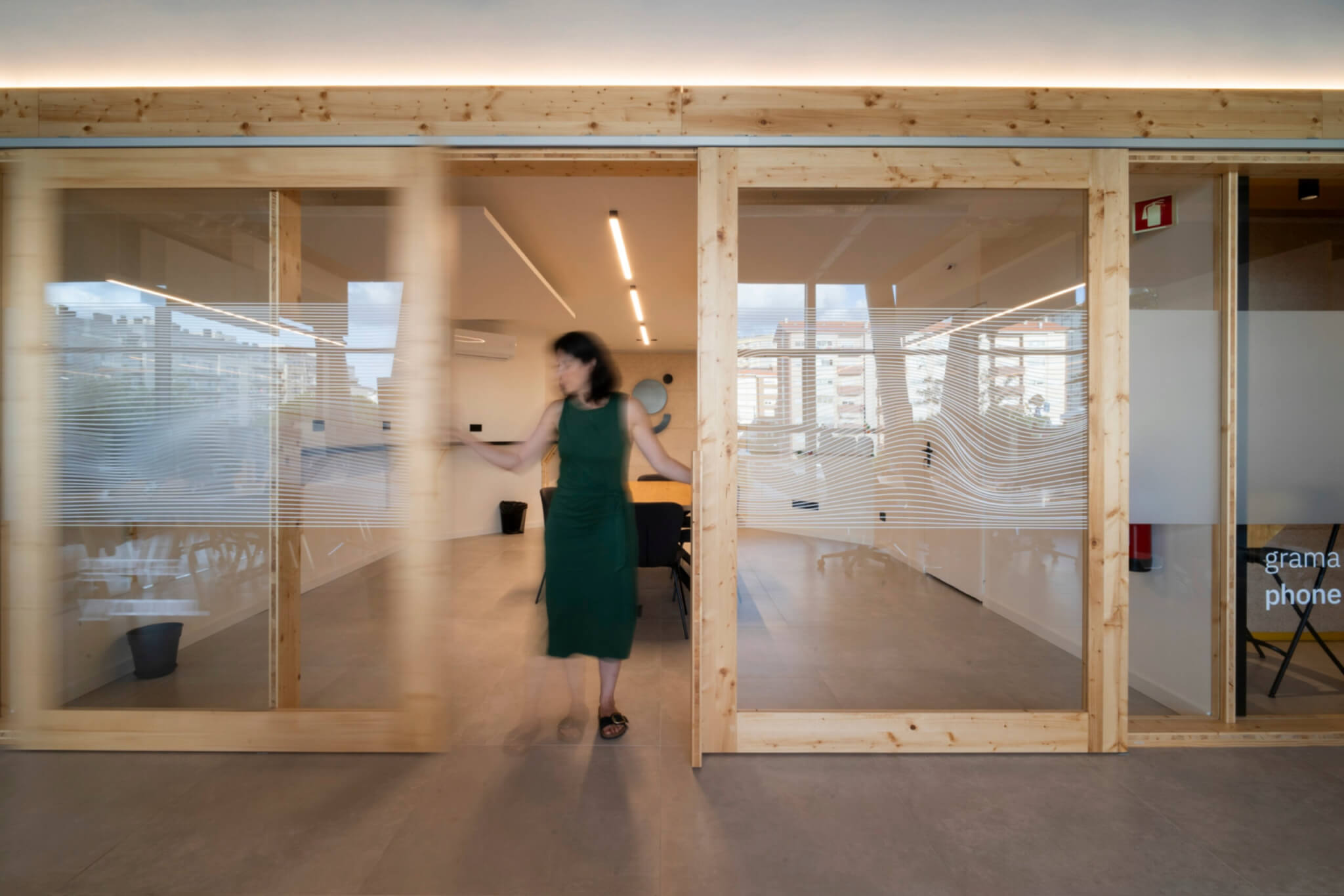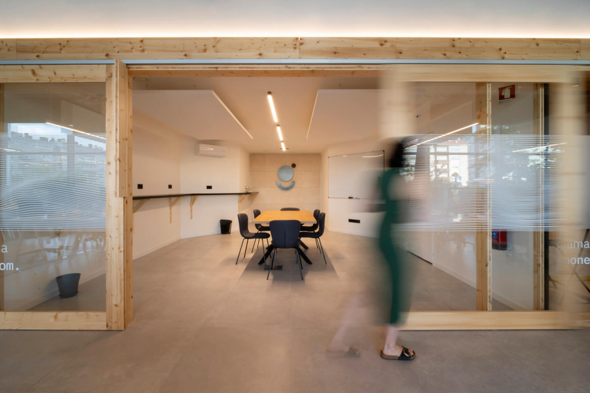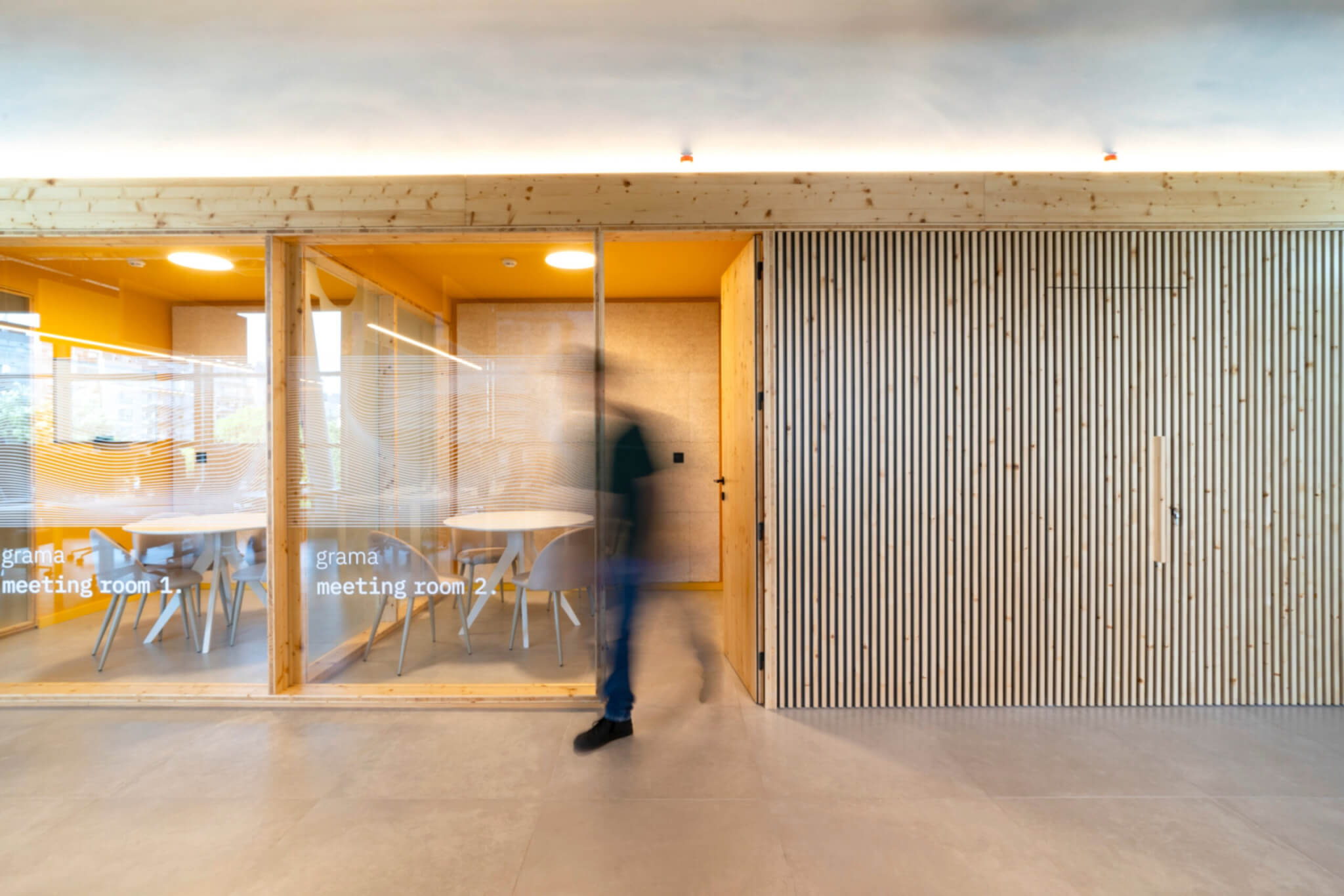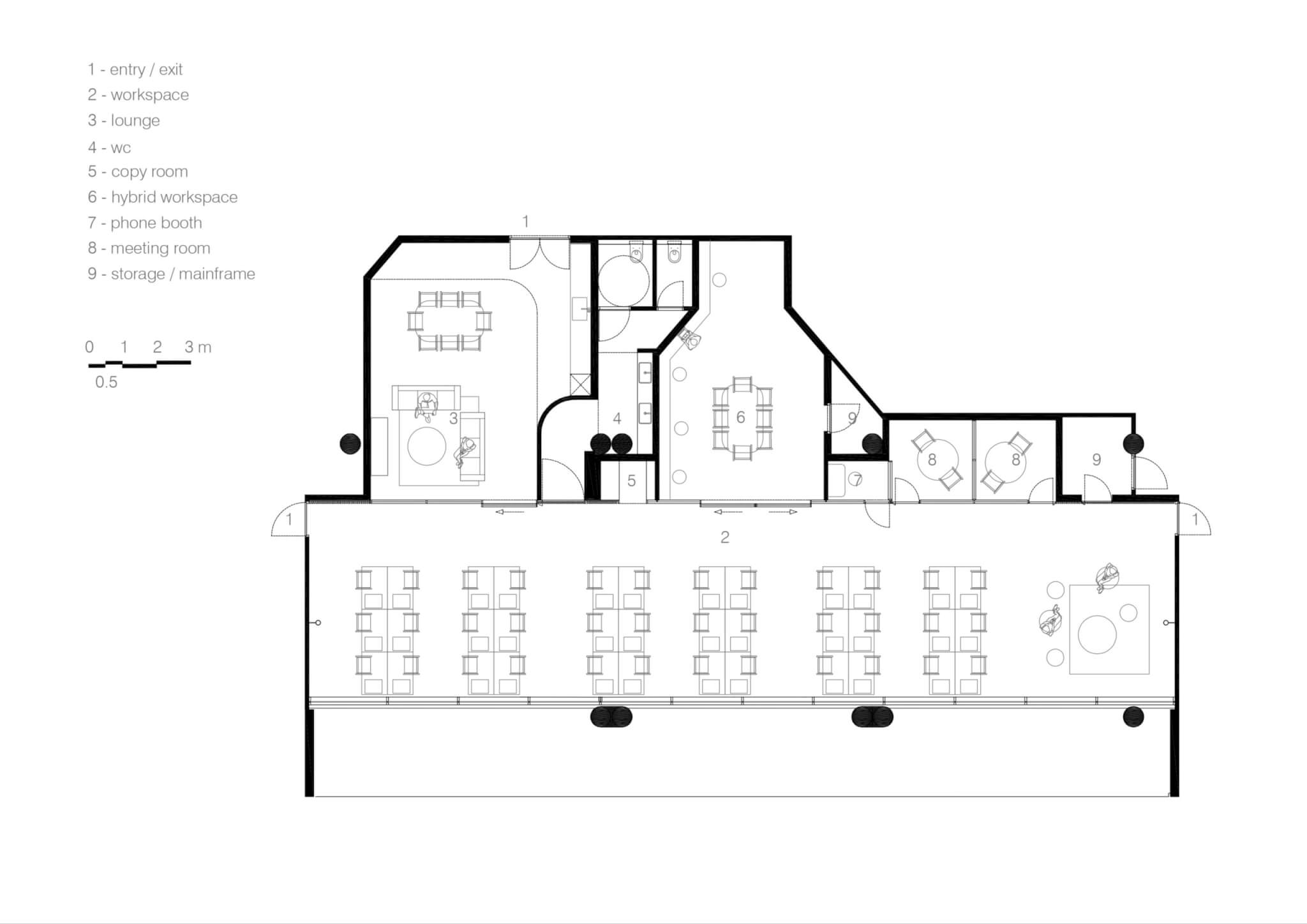 Neste sentido, podemos dizer que a abordagem design–build permitiu que as opções de projeto fossem avaliadas e ajustadas em tempo real, assegurando o alinhamento entre a intenção arquitetónica, a viabilidade técnica, os requisitos funcionais e as restrições orçamentais. Das diversas iterações com o cliente, num processo de ação–resposta , chegou-se a uma solução espacial flexível, suficientemente adaptável ao fluxo de trabalho da empresa e necessidade das equipas de desenvolvimento. As áreas de trabalho em open space constituem o núcleo da organização espacial, complementadas por salas de reunião fechadas, zonas informais de colaboração e outros espaços de apoio, utilizando a circulação como elemento organizador central, incentivando a interação e estruturando o programa global.