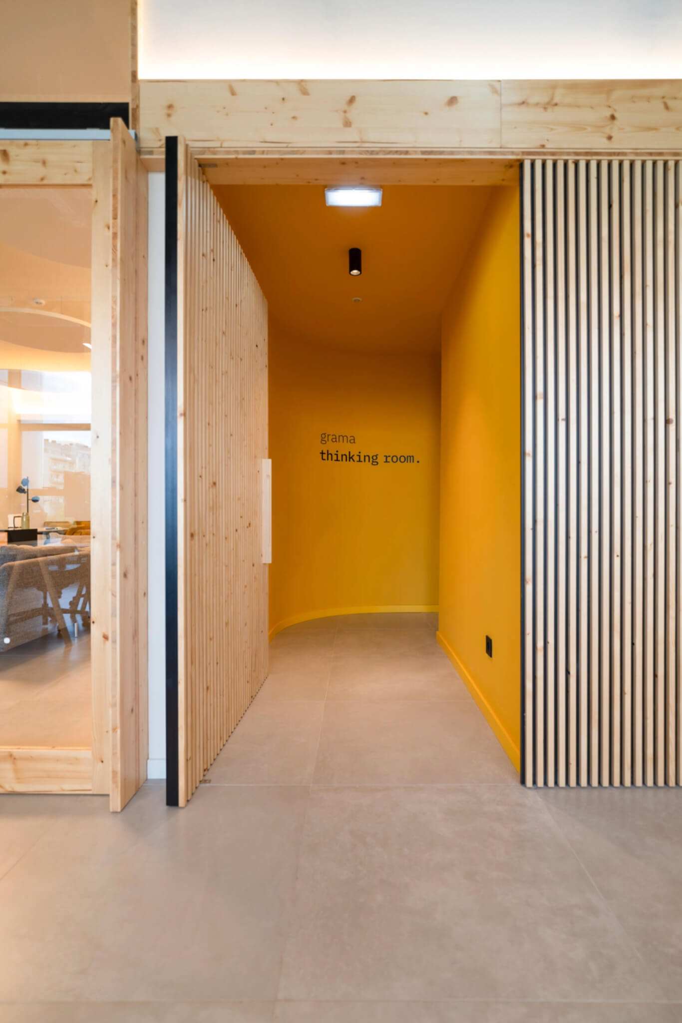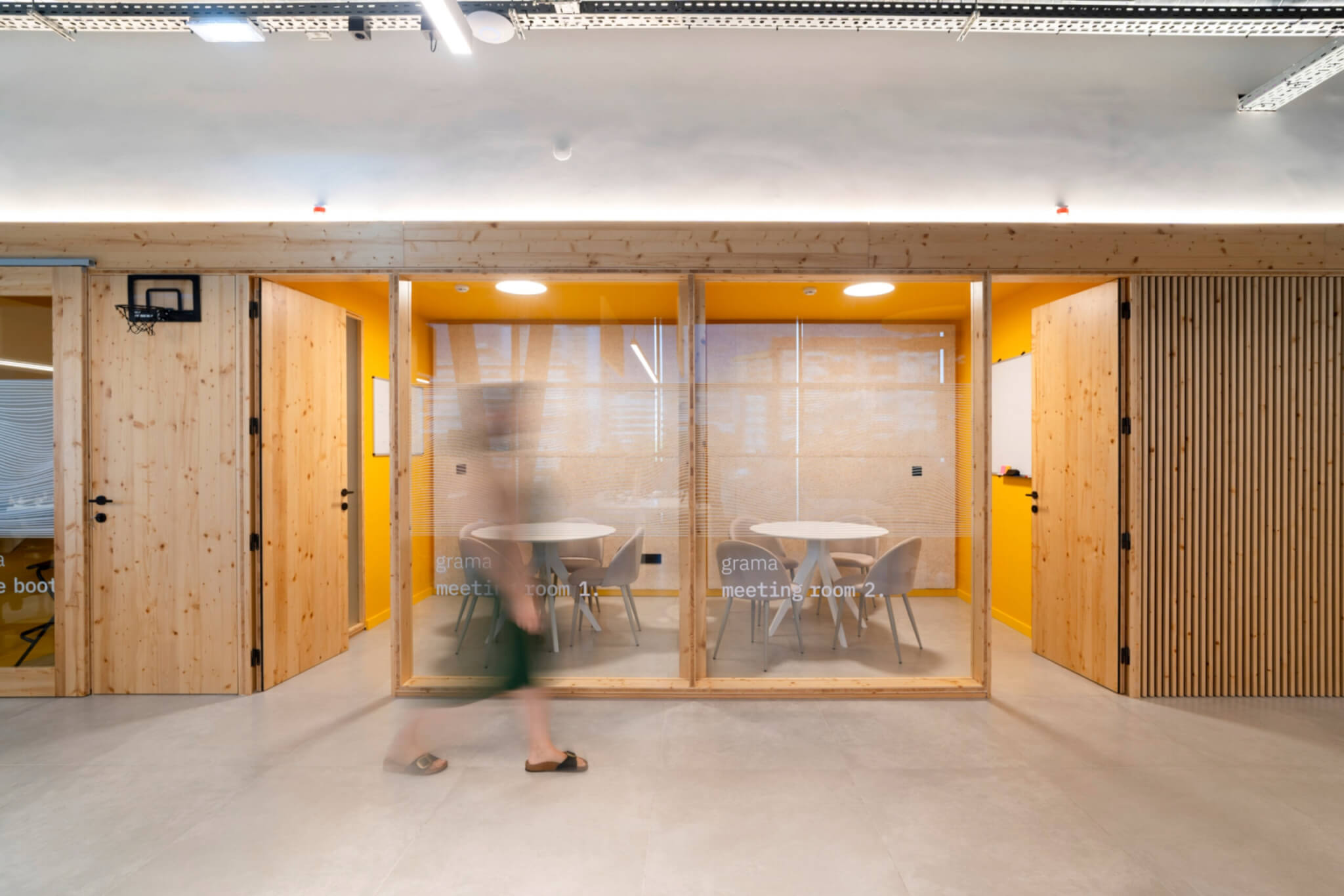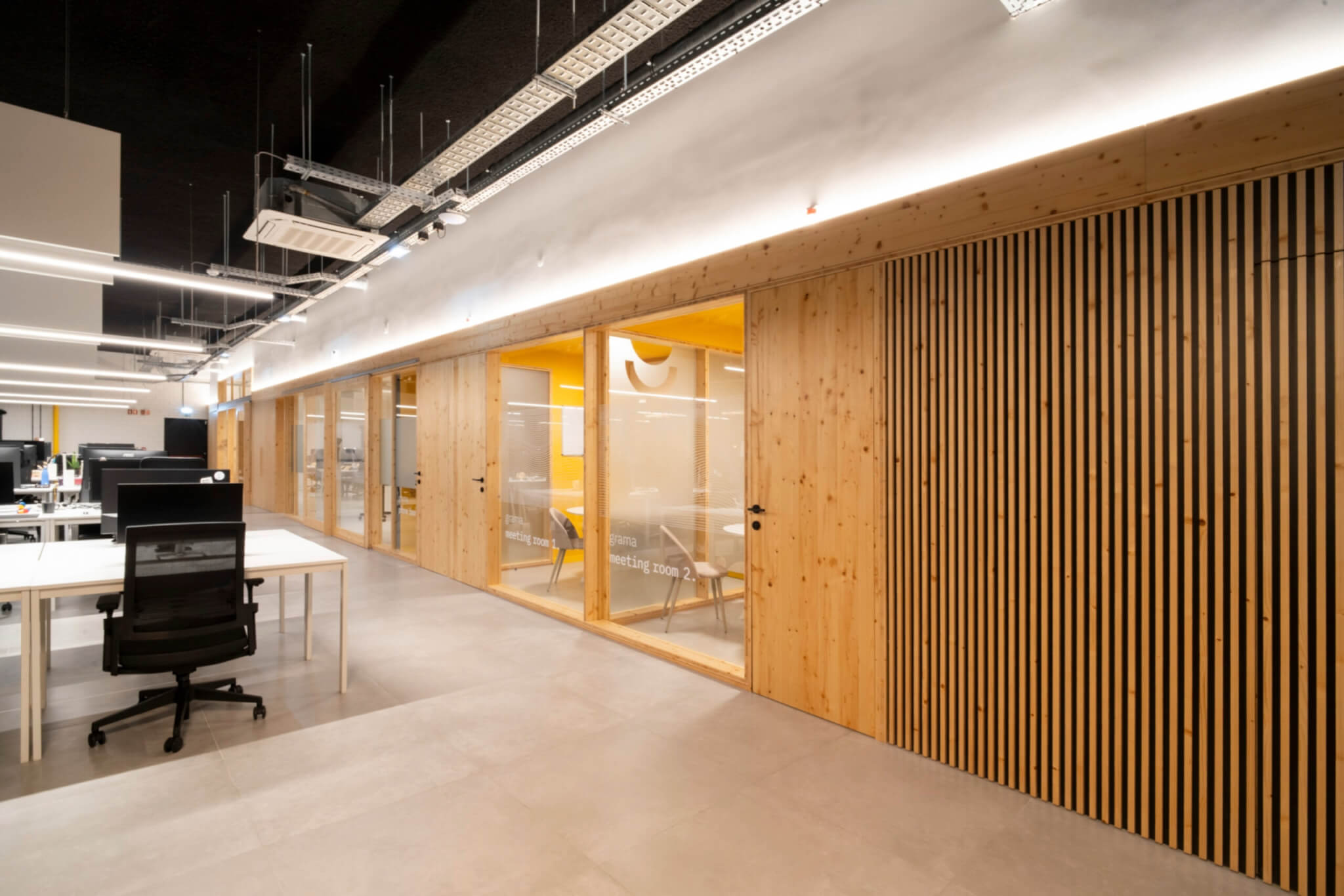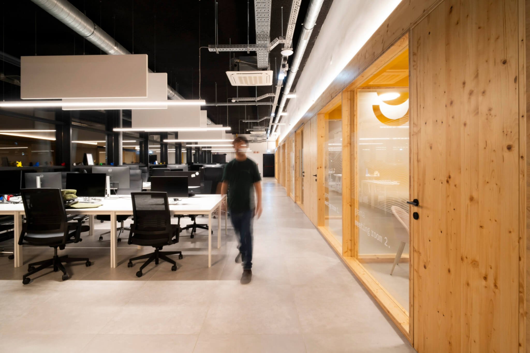 Elementos acústicos suspensos e soluções de iluminação foram estrategicamente dispostos e combinados para definir diferentes zonas de trabalho sem comprometer a continuidade espacial. Variações de escala, densidade e alinhamento ajudam a articular o espaço, melhorar o conforto acústico e criar uma paisagem de teto mais rica e estratificada. Ao nível dos materiais, optámos conscientemente por superfícies neutras, enquanto elementos em madeira de pinho — como revestimentos, caixilharias e portas — introduzem um elemento de calor no conjunto. Os tons preto e amarelo, retirados da identidade corporativa do cliente, são utilizados de forma seletiva para diferenciar funções, reforçando a continuidade visual em todo o espaço de trabalho.