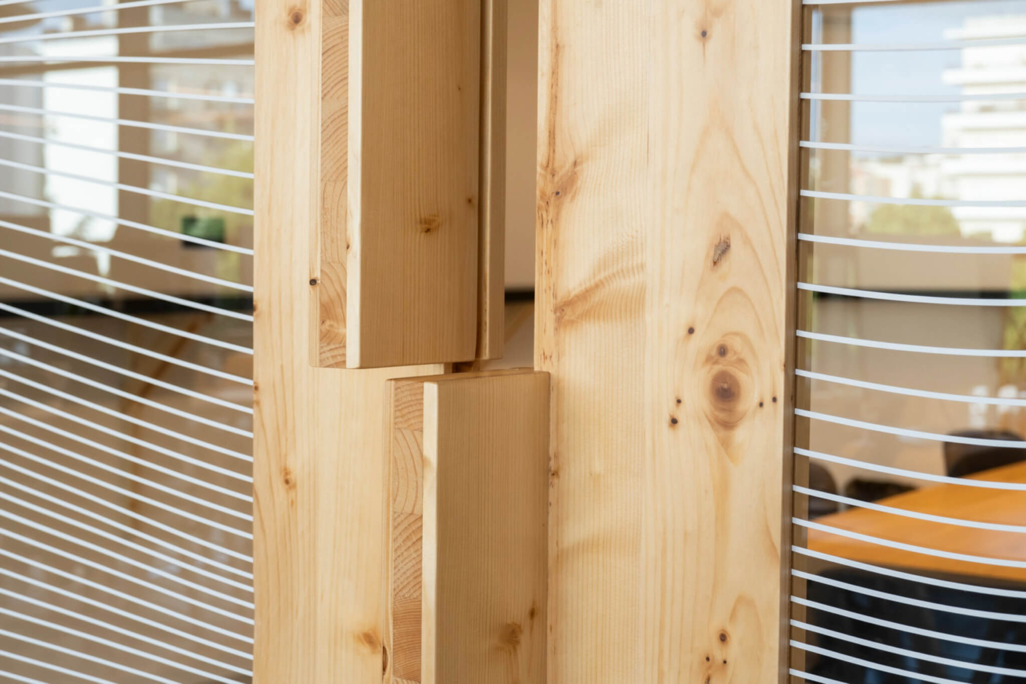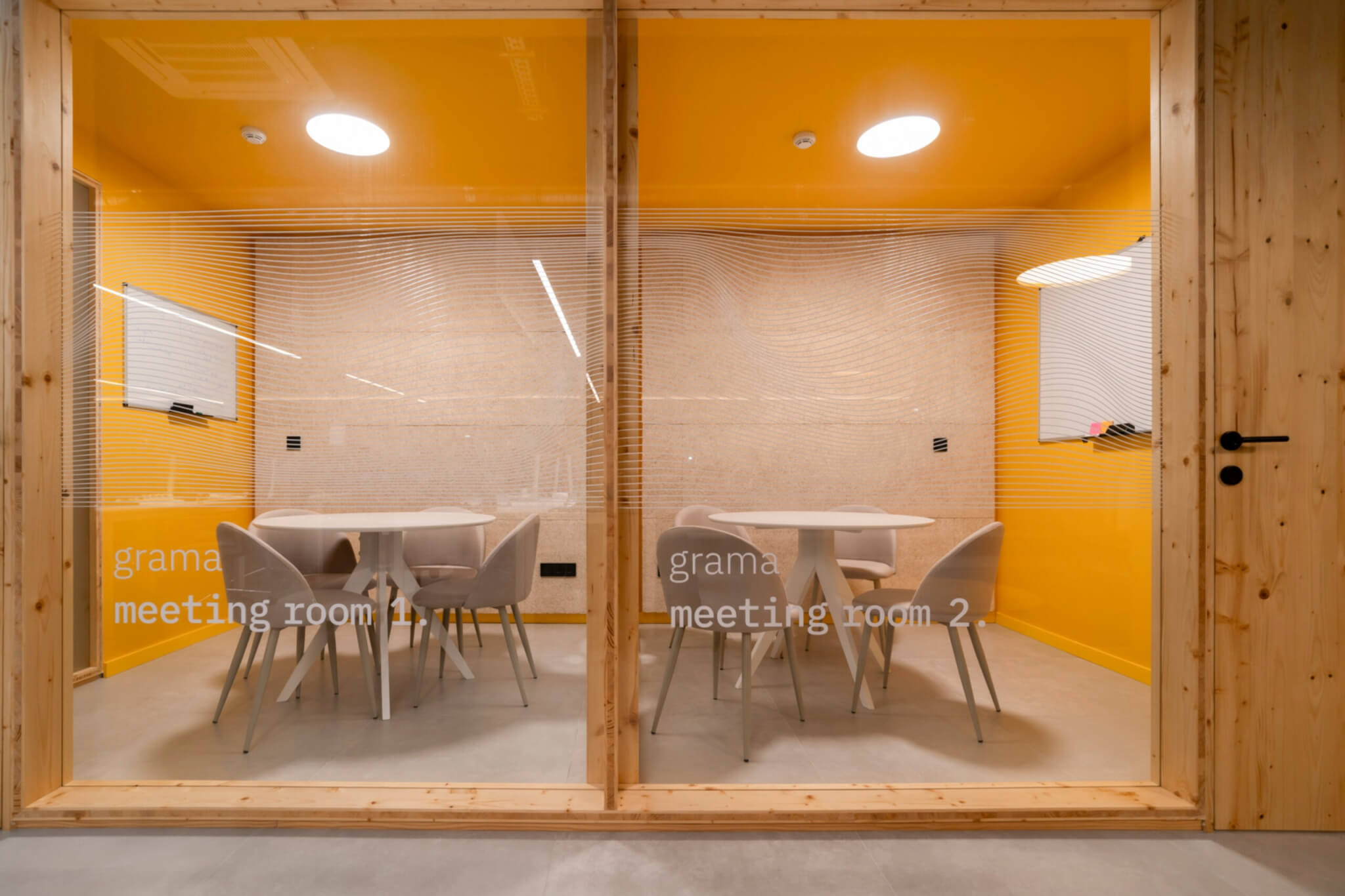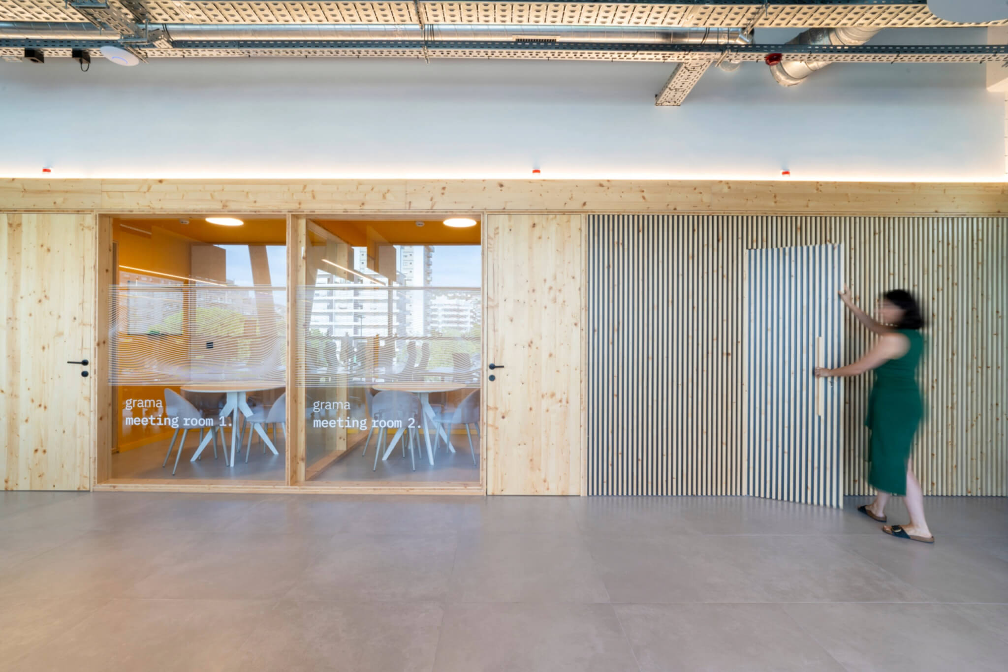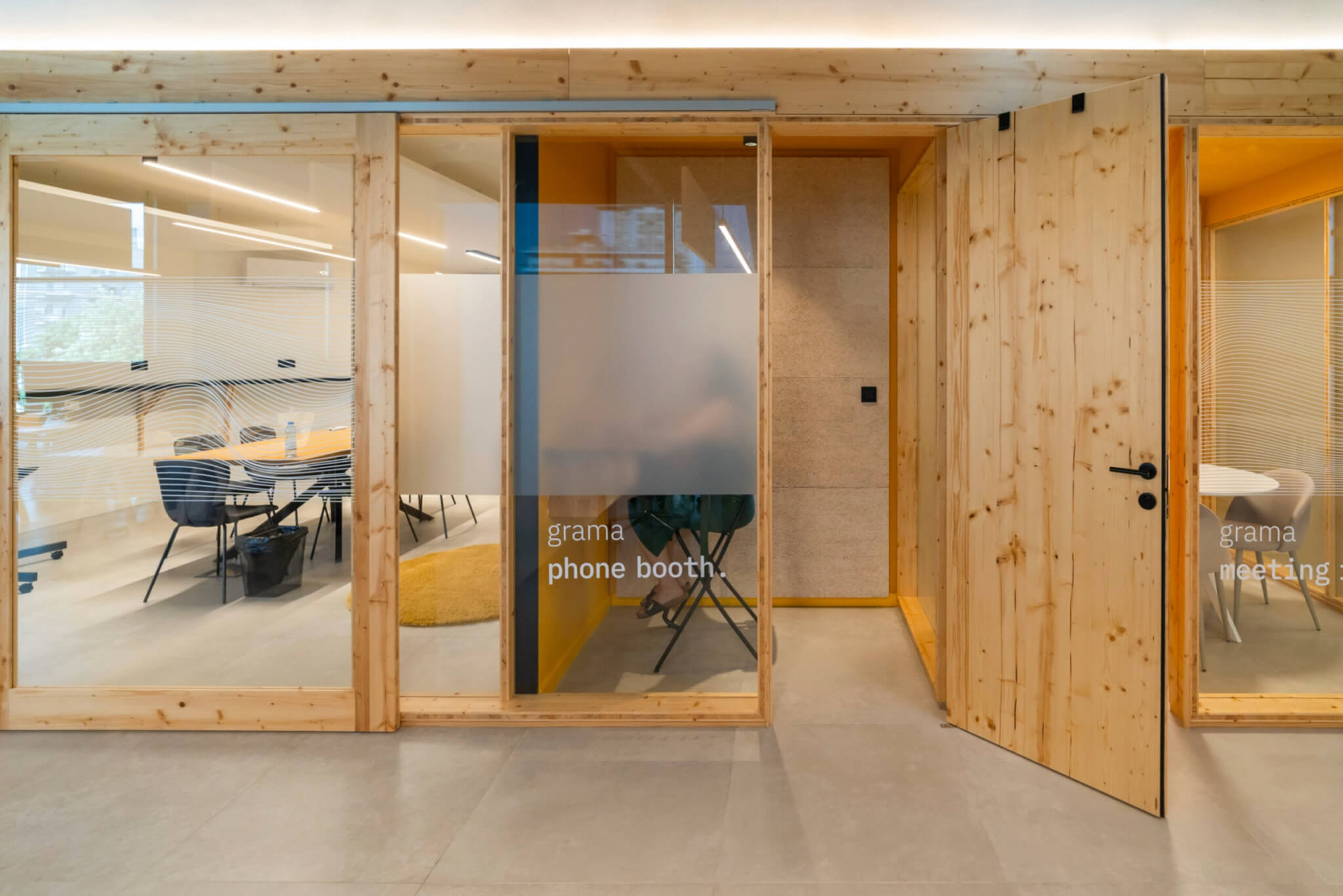 Elementos acústicos suspensos e soluções de iluminação foram estrategicamente dispostos e combinados para definir diferentes zonas de trabalho sem comprometer a continuidade espacial. Variações de escala, densidade e alinhamento ajudam a articular o espaço, melhorar o conforto acústico e criar uma paisagem de teto mais rica e estratificada. Ao nível dos materiais, optámos conscientemente por superfícies neutras, enquanto elementos em madeira de pinho — como revestimentos, caixilharias e portas — introduzem um elemento de calor no conjunto. Os tons preto e amarelo, retirados da identidade corporativa do cliente, são utilizados de forma seletiva para diferenciar funções, reforçando a continuidade visual em todo o espaço de trabalho.